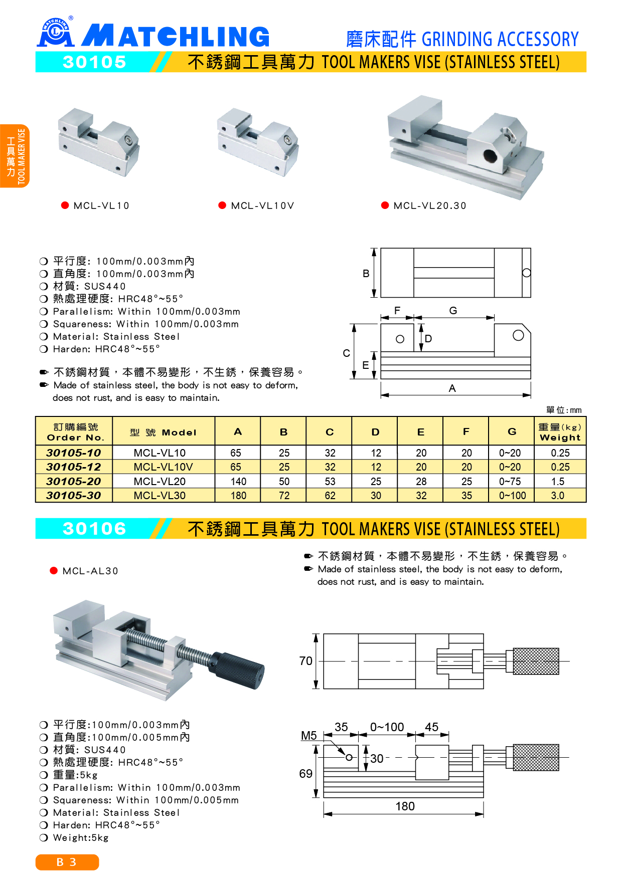 ● 不銹鋼材質,真空熱處理後經深冷處理再進行研磨加工,因此本體不易變形,不生銹,易於保養。 ■ 規格: ● 平行度:100mm/0.003mm內 ● 直角度:100mm/0.005mm內 ● 材質:SUS440(不銹鋼) ● 熱處理硬度: HRC48°~55° ● 重量:5kg