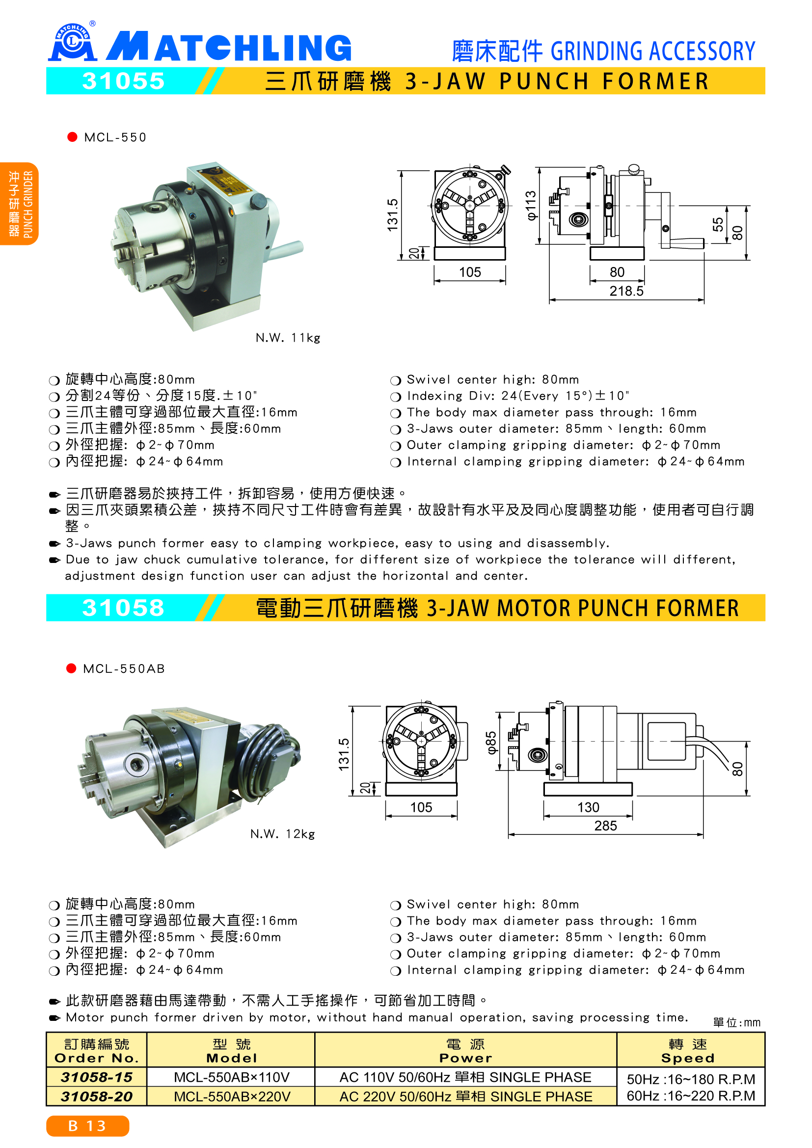■ 特性: 三爪研磨器易於挾持工件,拆卸容易,使用方便快速。 因三爪夾頭累積公差,挾持不同尺寸工件時會有差異,故設計有水平及及同心度調整功能,使用者可自行調整。 ■ 規格: 旋轉中心高度:80mm 分割24等份、分度15度.±10" 三爪主體可穿過部位最大直徑:16mm 三爪主體外徑:85mm、長度:60mm 外徑把握: φ2~φ70mm 內徑把握: φ24~φ64mm 重量:10kg Michilin