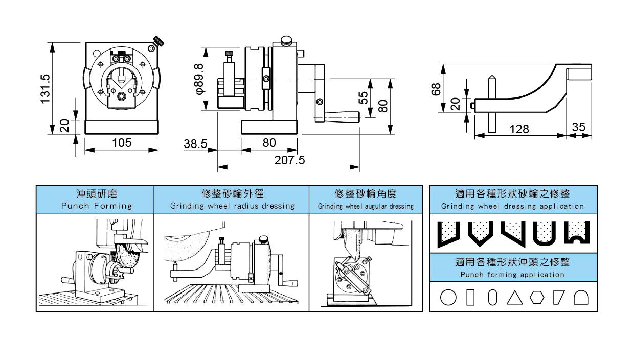 - 配合弓柄,即可做為修整砂輪的的凹凸R和角度。