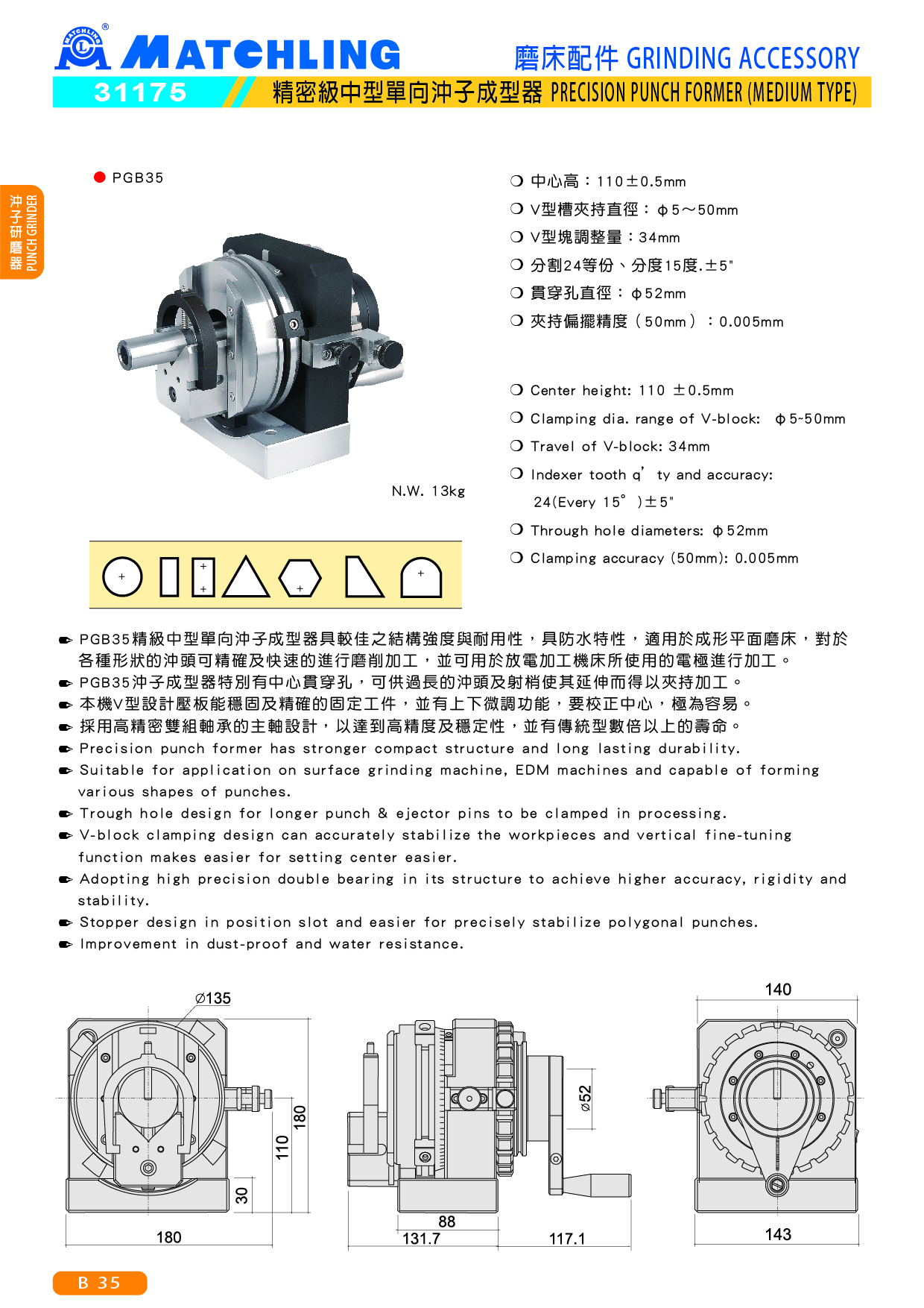 ● PGB35沖子成型器特別有中心貫穿孔,可供過長的沖頭及射梢使其延伸而得以夾持加工。