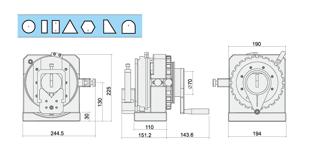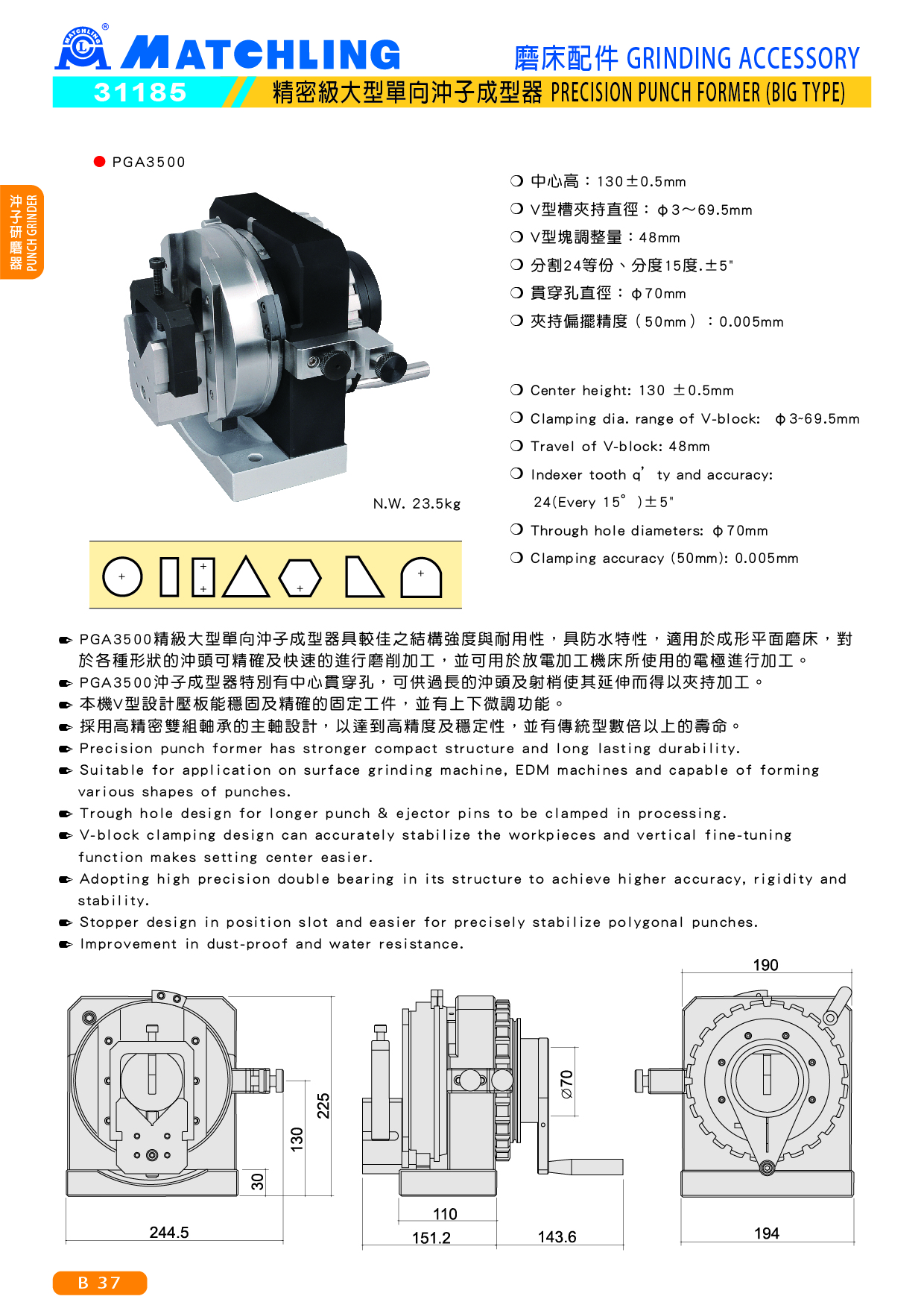● PGA3500精級大型單向沖子成型器具較佳之結構強度與耐用性,具防水特性,適用於成形平面磨床,對於各種形狀的沖頭可精確及快速的進行磨削加工,並可用於放電加工機床所使用的電極進行加工。 ● PGA3500沖子成型器特別有中心貫穿孔,可供過長的沖頭及射梢使其延伸而得以夾持加工。 ● 本機V型設計壓板能穩固及精確的固定工件,並有上下微調功能。 ● 採用高精密雙組軸承的主軸設計,以達到高精度及穩定性,並有傳統型數倍以上的壽命。 ● V型塊非不鏽鋼製作。 ■ 規格: ● 中心高:130±0.5mm ● V型槽夾持直徑:φ3~69.5mm ● V型塊調整量:48mm ● 分割24等份、分度15度.±5" ● 貫穿孔直徑:φ72mm ● 夾持偏擺精度(50mm):0.005mm