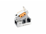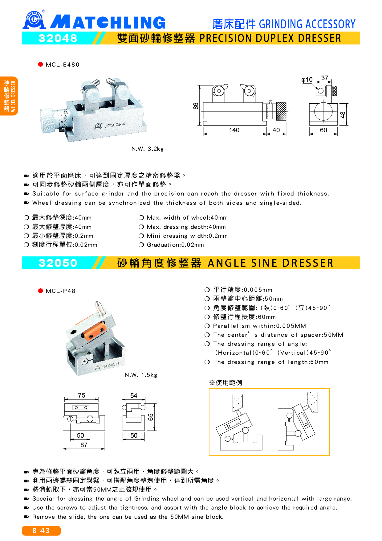 ● 專為修整平面砂輪角度,可臥立兩用,角度修整範圍大。 ● 利用兩邊螺絲固定鬆緊,可搭配角度墊塊使用,達到所需角度。 ● 將滑軌取下,亦可當50MM之正弦規使用。 ■ 規格: ● 平行精度:0.005mm ● 兩墊輪中心距離:50mm ● 角度修整範圍: (臥)0~60°(立)45~90° ● 修整行程長度:60mm ● 重量:1.5kg ■ 配件: 1. 鑽石筆1支