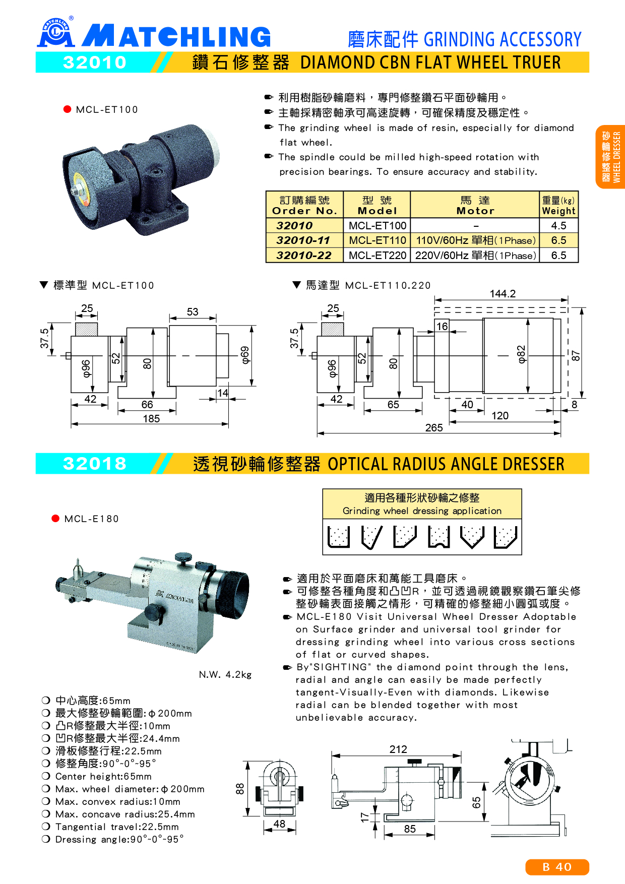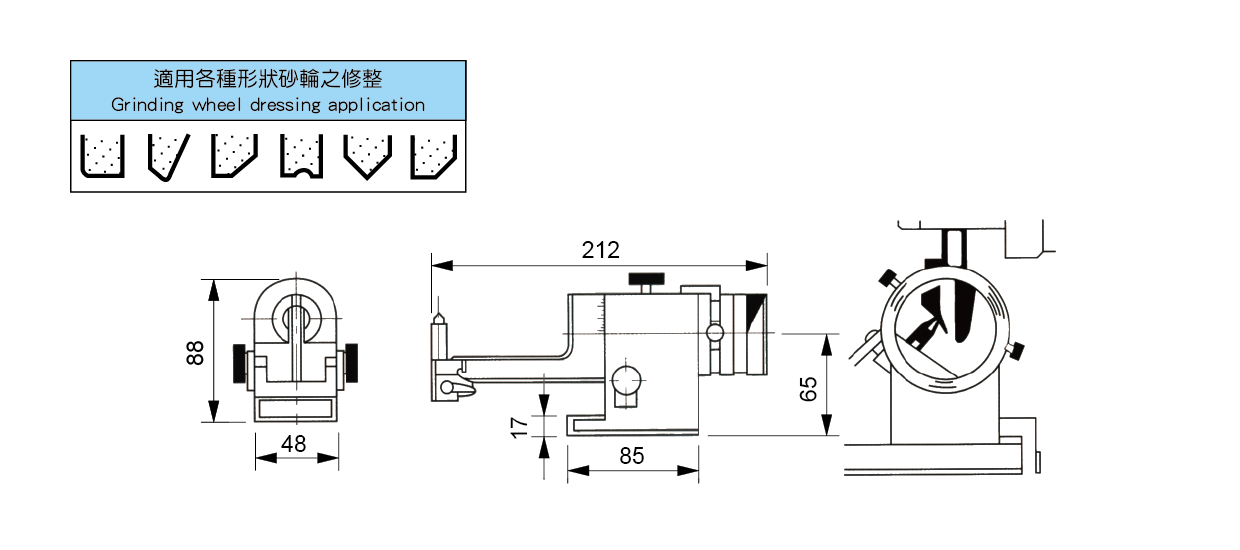 ● 適用於平面磨床和萬能工具磨床。 ● 可修整各種角度和凸凹R,並可透過視鏡觀察鑽石筆尖修整砂輪表面接觸之情形,可精確的修整細小圓弧或度。 ■ 規格: ● 中心高度:65mm ● 最大修整砂輪範圍:φ200mm ● 凸R修整最大半徑:10mm ● 凹R修整最大半徑:24.4mm ● 滑板修整行程:22.5mm ● 修整角度:90°~0°~95° ● 重量:4.2kg