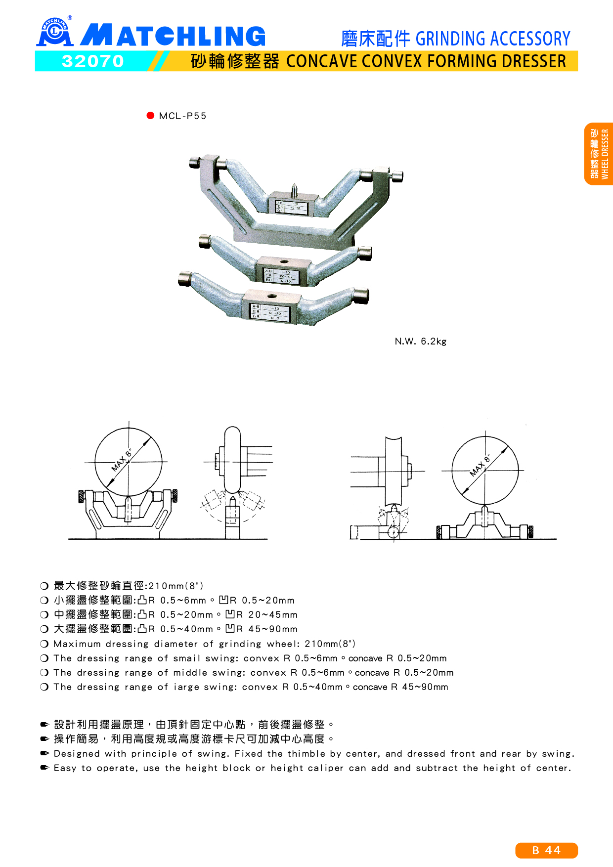 ● 設計利用擺盪原理,由頂針固定中心點,前後擺盪修整。 ● 操作簡易,利用高度規或高度游標卡尺可加減中心高度。 ■ 規格: ● 最大修整砂輪直徑:210mm(8") ● 小擺盪修整範圍:凸R 0.5~6mm。凹R 0.5~20mm ● 中擺盪修整範圍:凸R 0.5~20mm。凹R 20~45mm ● 大擺盪修整範圍:凸R 0.5~40mm。凹R 45~90mm ● 重量:6.2kg ■ 配件: 1. 鑽石筆1支。 2. 固定頂針2支。