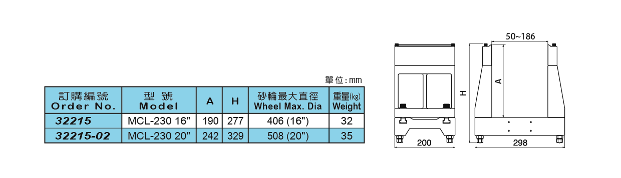 設計有精密的滑板底座,和直立式水平基座。 水平基座可隨校正砂輪的大小,移動調整基座的寬度。 水平板經過精密研磨,熱處理硬度HRC58~60°可精確的滾動校正砂輪重心。 底座利用4顆螺絲來調整水平面。 最大校正砂輪直徑406mm(16")。 外觀尺寸300×200×250mm。 重量:32kg。