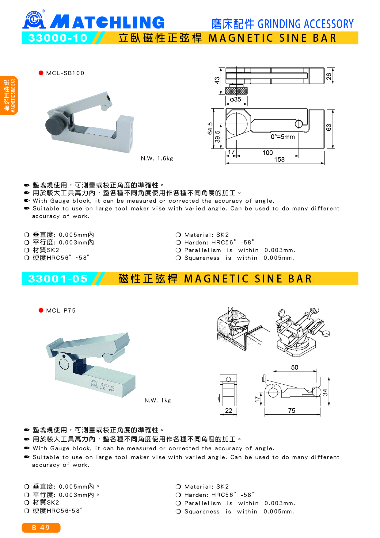● 墊塊規使用,可測量或校正角度的準確性。 ● 用於較大工具萬力內,墊各種不同角度使用。 ● 作各種不同角度的加工。 ● 垂直度: 0.005mm內。 ● 平行度: 0.003mm內。 ● 材質YK30。 ● 硬度HRC56~58°。 ● 重量:1.6kg。