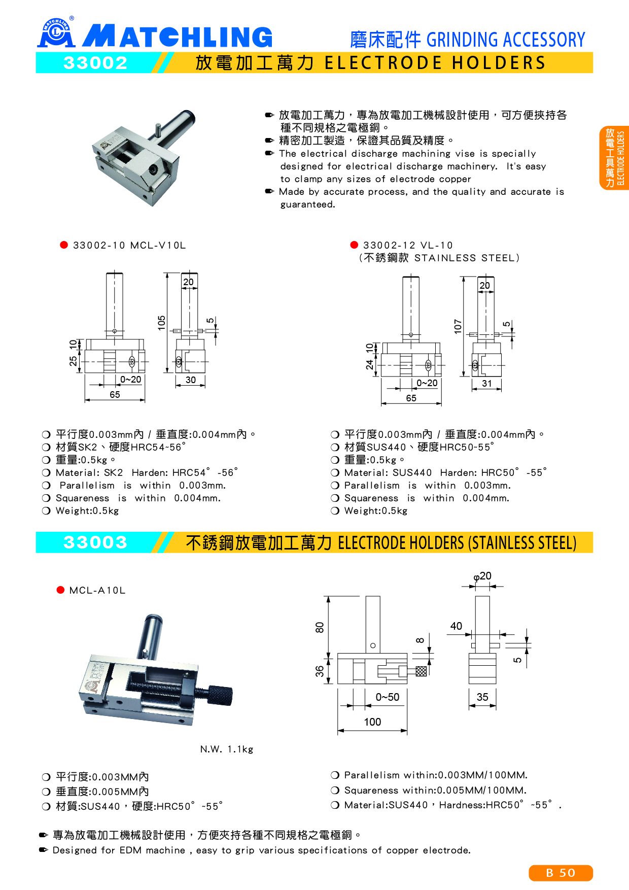 ● 放電加工萬力,專為放電加工機械設計使用,可方便挾持各種不同規格之電極銅。 ● 精密加工製造,保證其品質及精度。 ■ MCL-V10L 規格: ● 平行度0.003mm內 / 垂直度:0.004mm內。 ● 材質SK2、硬度HRC54~56° ● 重量:0.5kg。 ■ VL-10 (不銹鋼) 規格: ● 平行度0.003mm內 / 垂直度:0.004mm內。 ● 材質SUS440、硬度HRC50~55° ● 重量:0.5kg。