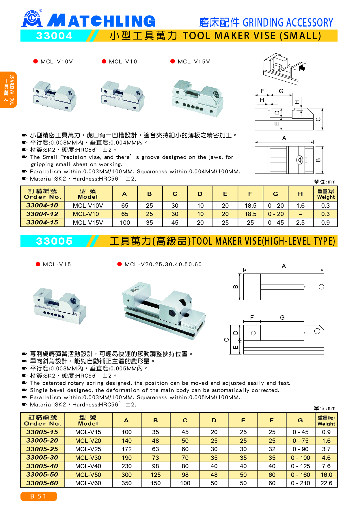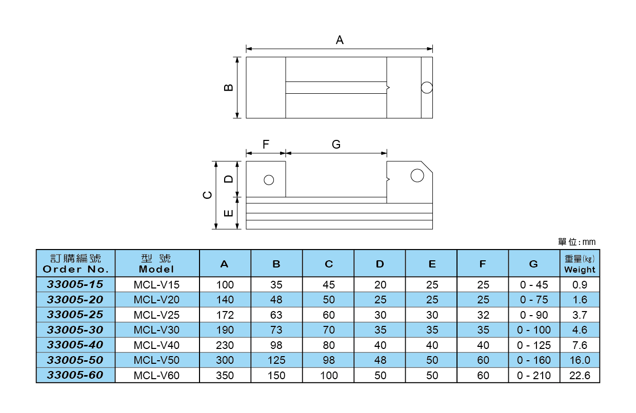 ● 旋轉彈簧活動設計,可輕易快速的移動調整挾持位置。 ● 單向斜角設計,能夠自動補正主體的變形量。 ● 平行度:0.003MM內,垂直度:0.005MM內。 ● 材質:SK2,硬度:HRC56°±2。 MCL-V15 MCL-V20 MCL-V25 MCL-V30 MCL-V40 MCL-V50 MCL-V60