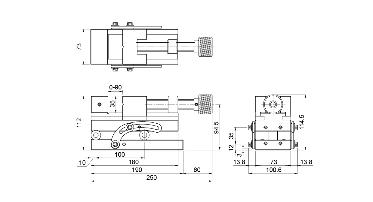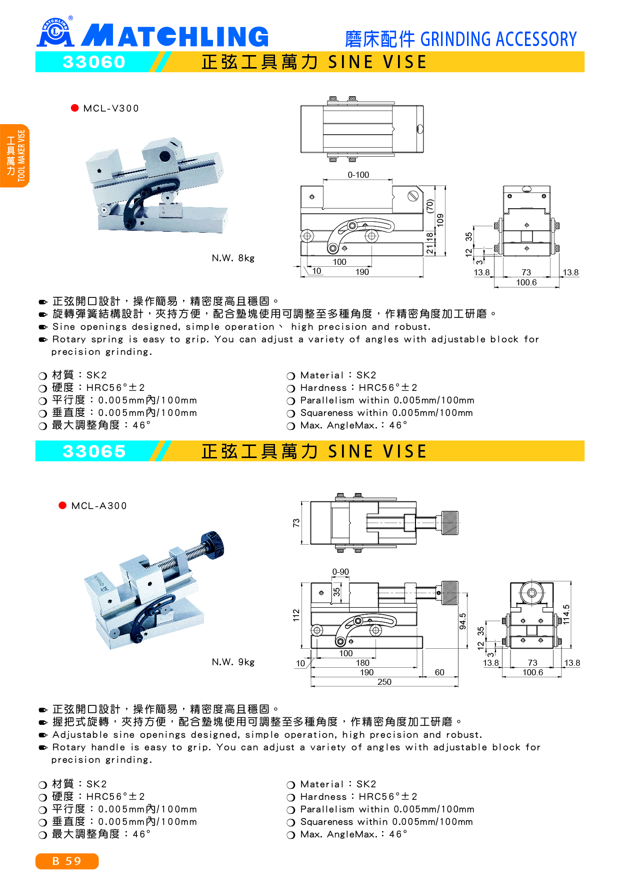 ● 正弦開口設計,操作簡易,精密度高且穩固。 ● 握把式旋轉,夾持方便,配合墊塊使用可調整至多種角度,作精密角度加工研磨。 ■ 規格: ● 材質:SK2 ● 硬度:HRC56°±2 ● 最大調整角度:46° ● 平行度:100mm/0.005mm內 ● 垂直度:100mm/0.005mm內