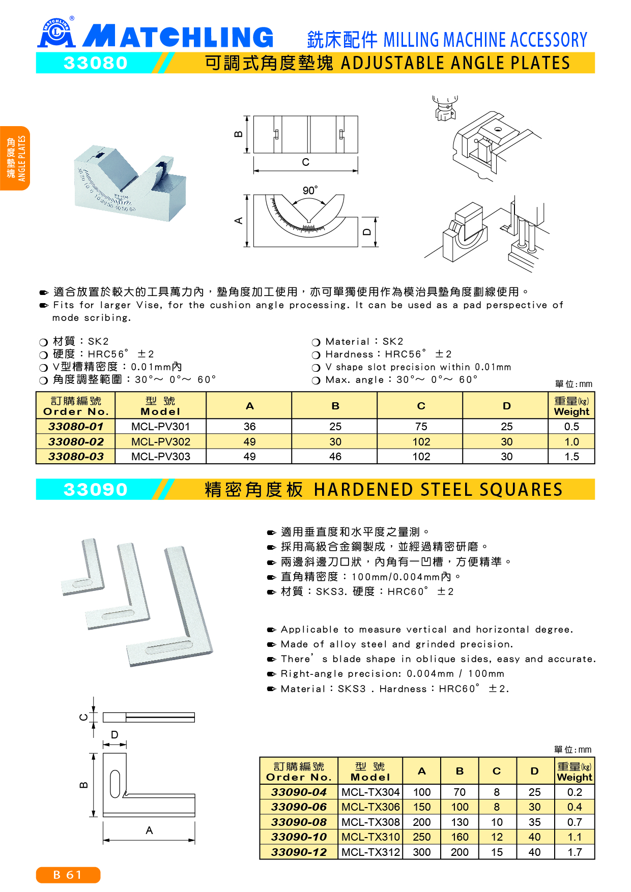 ● 適用垂直度和水平度之量測。 ● 採用高級合金鋼製成,並經過精密研磨。 ● 兩邊斜邊刀口狀,內角有一凹槽,方便精準。 ● 直角精密度:100mm/0.004mm內。 ● 材質:SKS3. 硬度:HRC60°±2 MCL-TX304 MCL-TX306 MCL-TX308 MCL-TX310 MCL-TX312