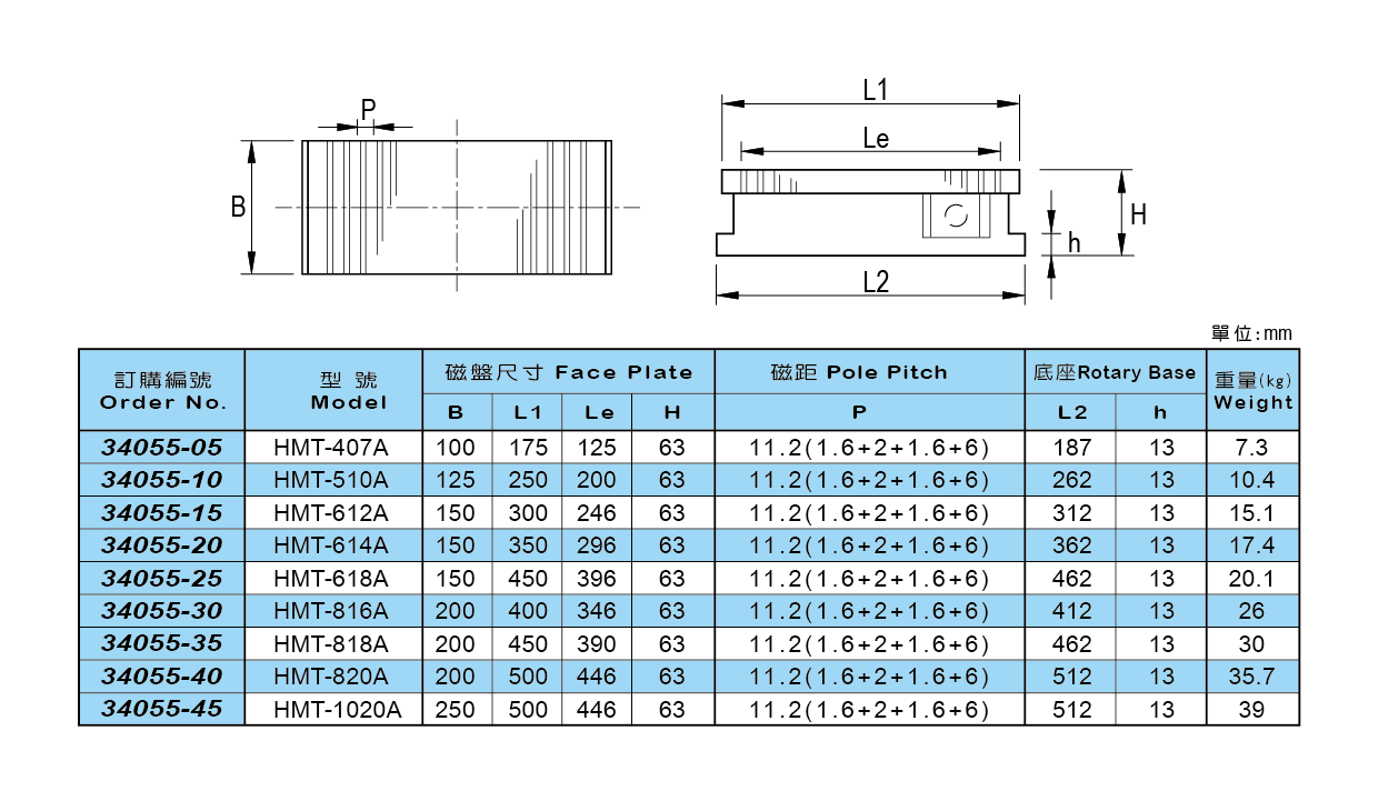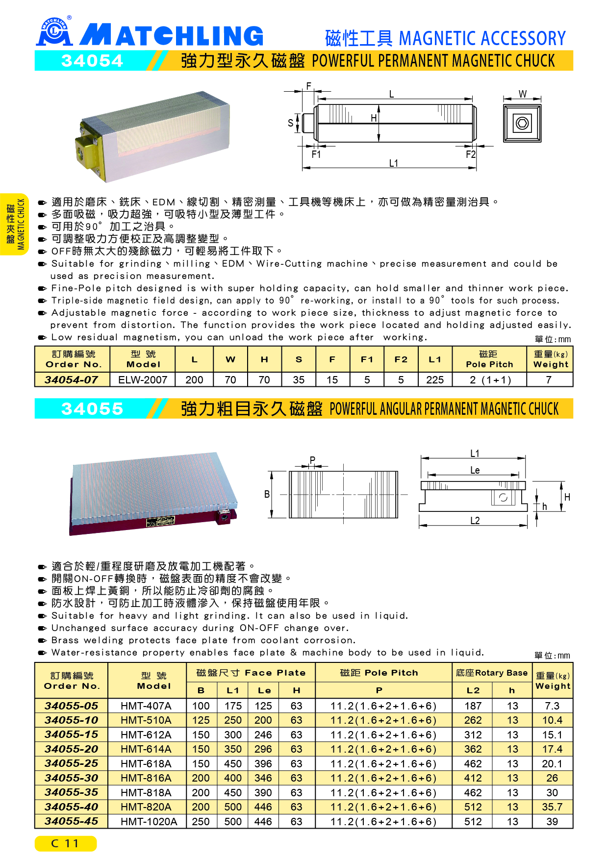 ● 適合於輕/重程度研磨及放電加工機配著。 ● 開關ON-OFF轉換時,磁盤表面的精度不會改變。 ● 面板上焊上黃銅,所以能防止冷卻劑的腐蝕。 ● 防水設計,可防止加工時液體滲入,保持磁盤使用年限。 HMT-407A HMT-510A HMT-612A HMT-614A HMT-618A HMT-816A HMT-818A HMT-820A HMT-1020 永久夾盤