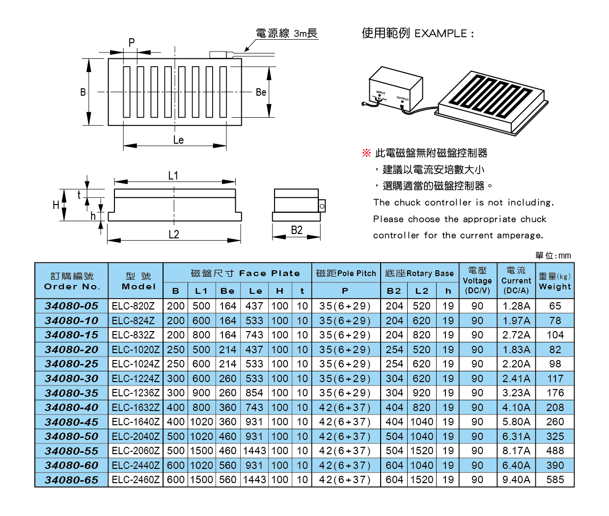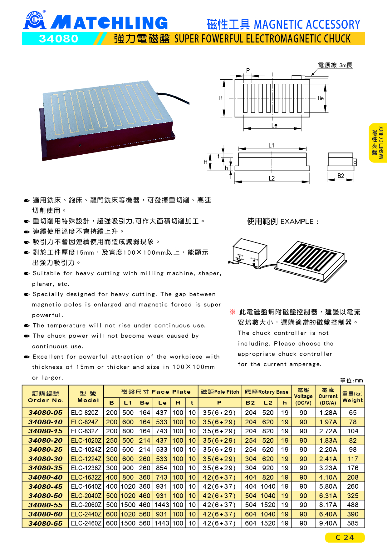 ● 適用銑床、鉋床、龍門銑床等機器,可發揮重切削、高速切削使用。 ● 重切削用特殊設計,超強吸引力,可作大面積切削加工。 ● 連續使用溫度不會持續上升。 ● 吸引力不會因連續使用而造成減弱現象。 ● 對於工件厚度15mm,及寬度100×100mm以上,能顯示出強力吸引力。 ELC-820Z ELC-824Z ELC-832Z ELC-1020Z ELC-1024Z ELC-1224Z ELC-1236Z ELC-1632Z ELC-1640Z ELC-2040Z ELC-2060Z ELC-2440Z ELC-2460Z