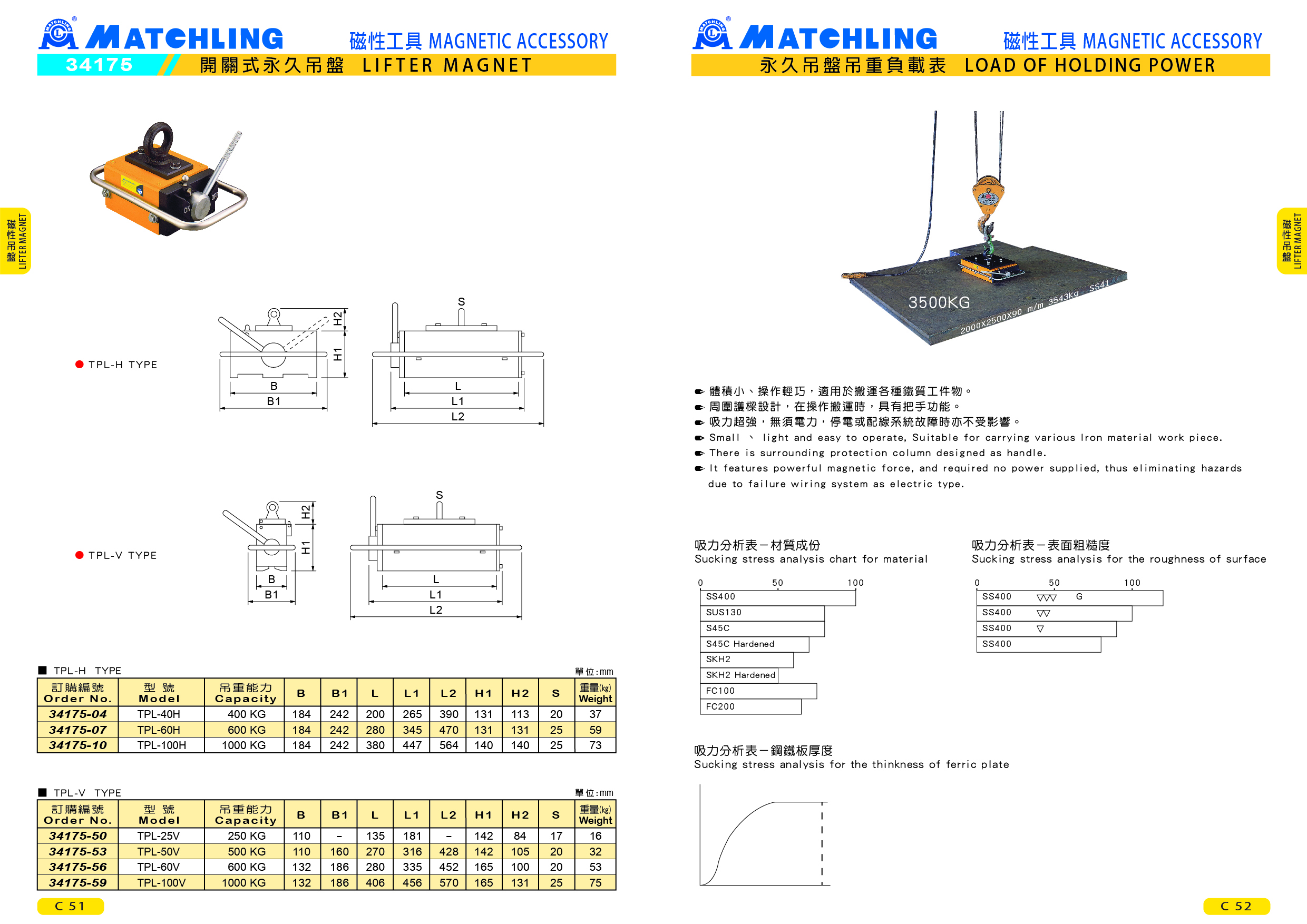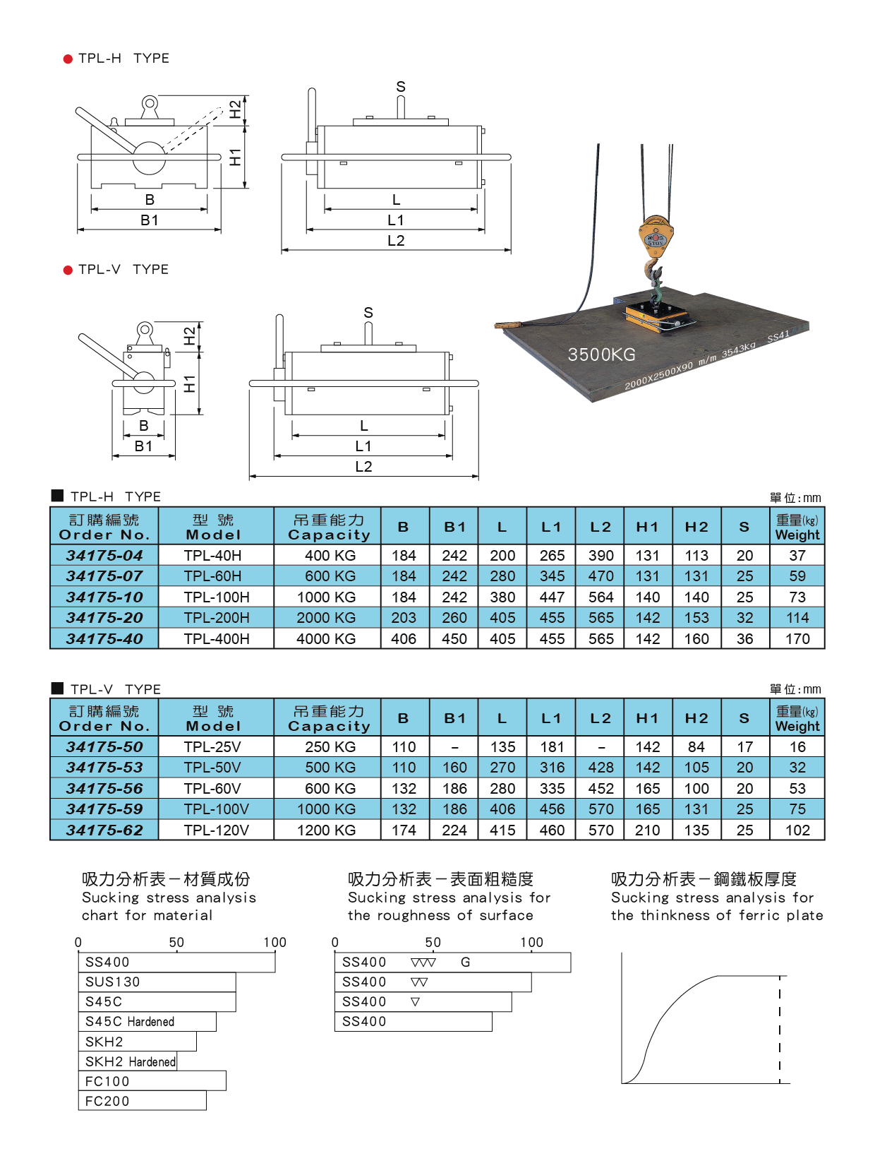 ● 體積小、操作輕巧,適用於搬運各種鐵質工件物。 ● 周圍護樑設計,在操作搬運時,具有把手功能。 ● 吸力超強,無須電力,停電或配線系統故障時亦不受影響。 3 TPL-40H TPL-60H TPL-100H TPL-200H TPL-400H TPL-25V TPL-50V TPL-60V TPL-100V TPL-120V