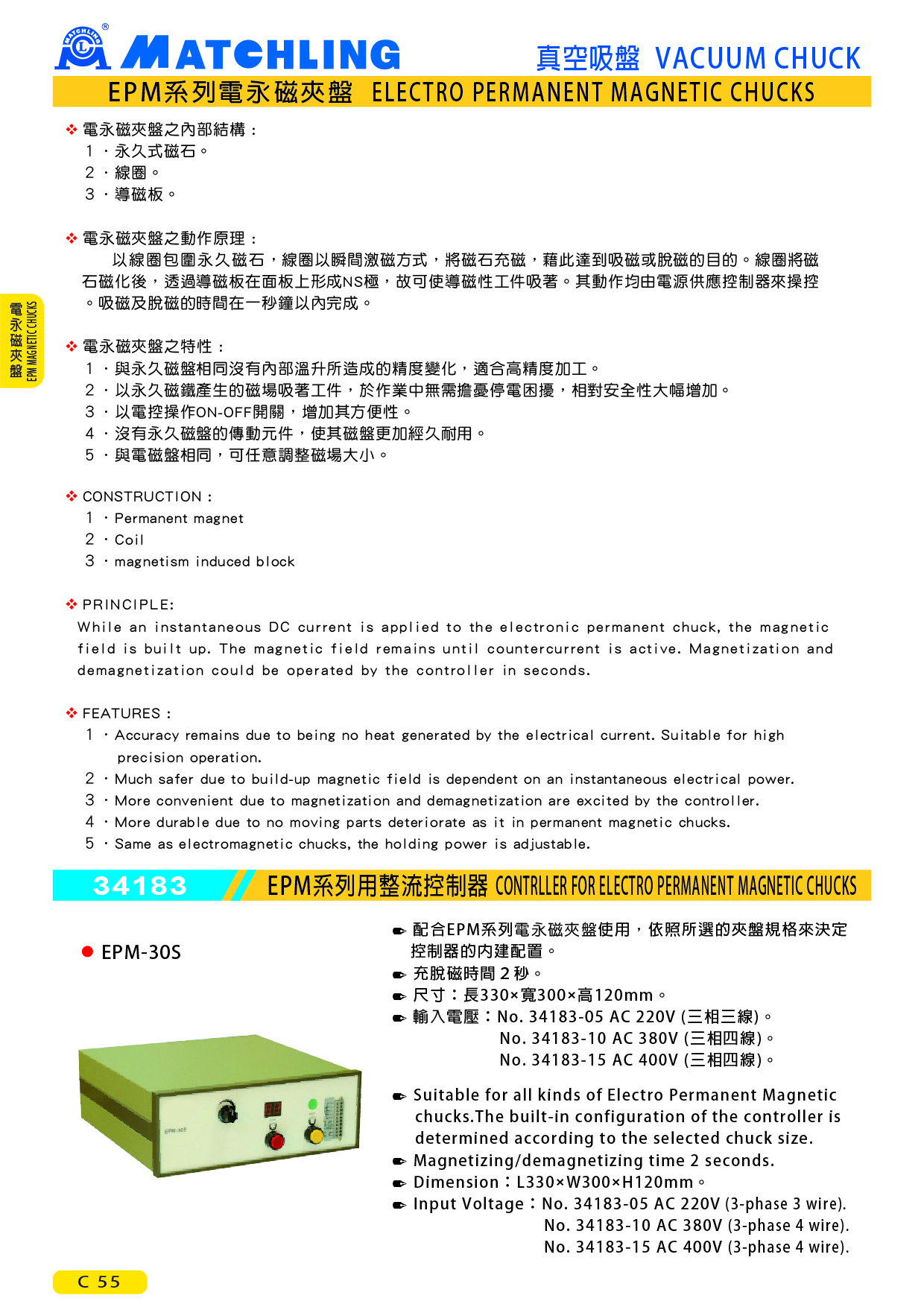 ● 適用於EPM系列之電永磁夾盤。 ● 充脫磁時間2秒。 ● 尺寸:長330×寬300×高120mm。 ● 輸入電壓:No. 34183-05 AC 220V (三相三線)。 No. 34183-10 AC 380V (三相四線)。 No. 34183-15 AC 400V (三相四線)。
