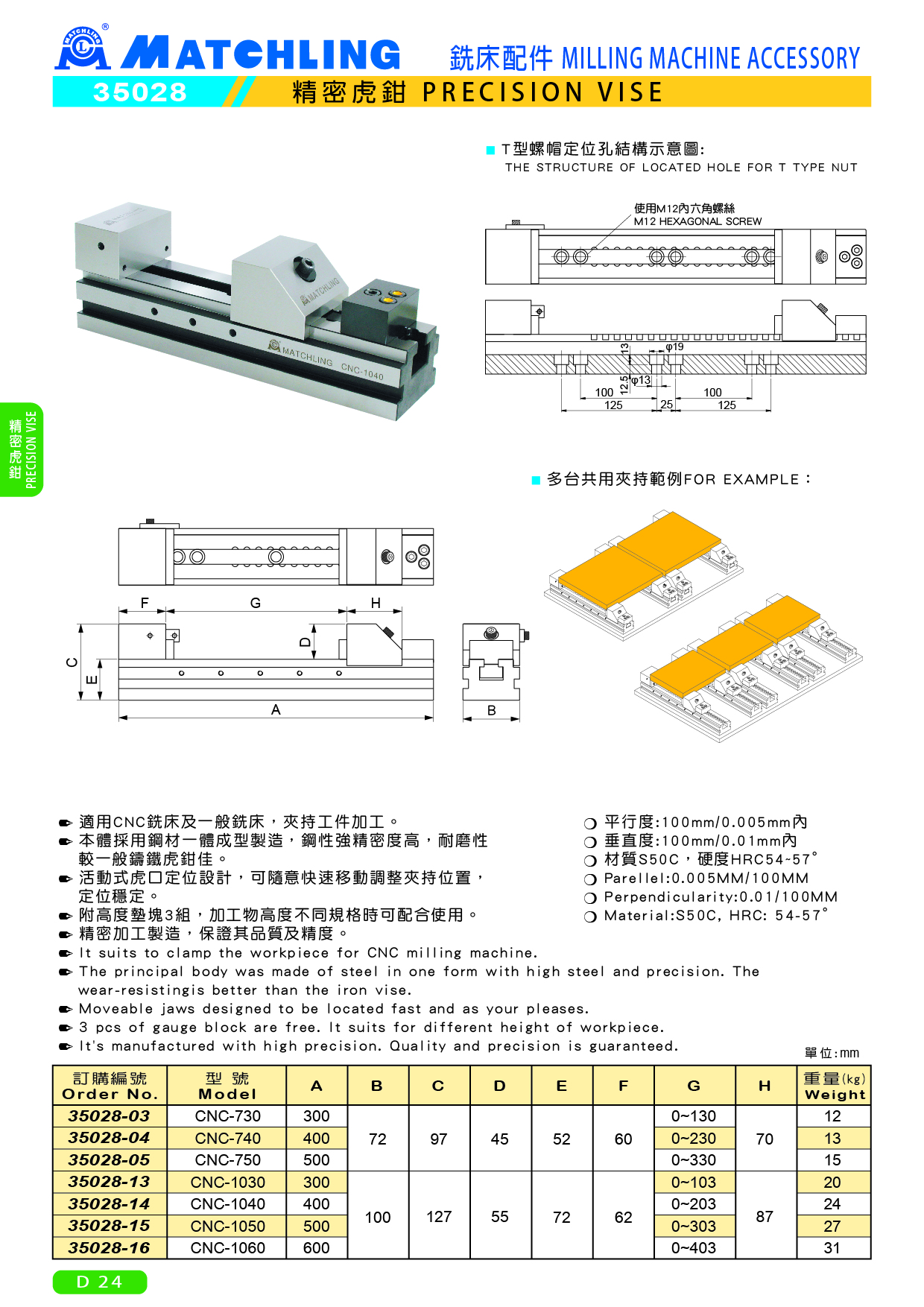 ● 適用CNC銑床及一般銑床,夾持工件 加工。 ● 本體採用鋼材一體成型製造,鋼性強 精密度高,耐磨性較一般鑄鐵虎鉗佳。