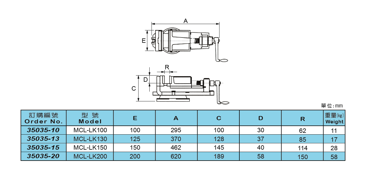 ● 簡易的機械設計,操作方便,適合作輕中切削使用. ● 本體和固定虎口為一體成形,夾持工件時可降低固定虎口向後傾斜. ● 底座有度數刻度,可360度旋轉. MCL-LK100 MCL-LK130 MCL-LK150 MCL-LK200