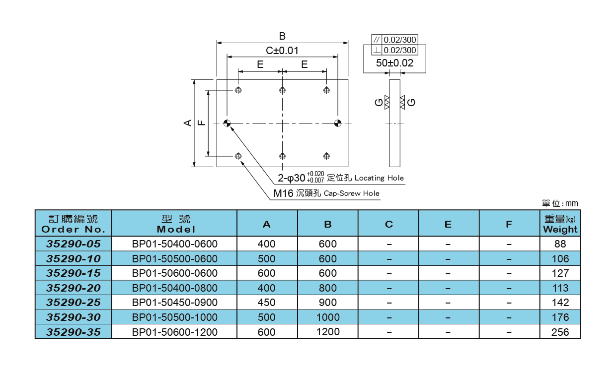 ● 材質:FC30,熱處理:燒鈍。 ● 適用於立式MC。 ● 可依實際需要,自行鑽孔加工製作專用治具。 BP01-50400-0600 BP01-50500-0600 BP01-50600-0600 BP01-50400-0800 BP01-50450-0900 BP01-50500-1000 BP01-50600-1200