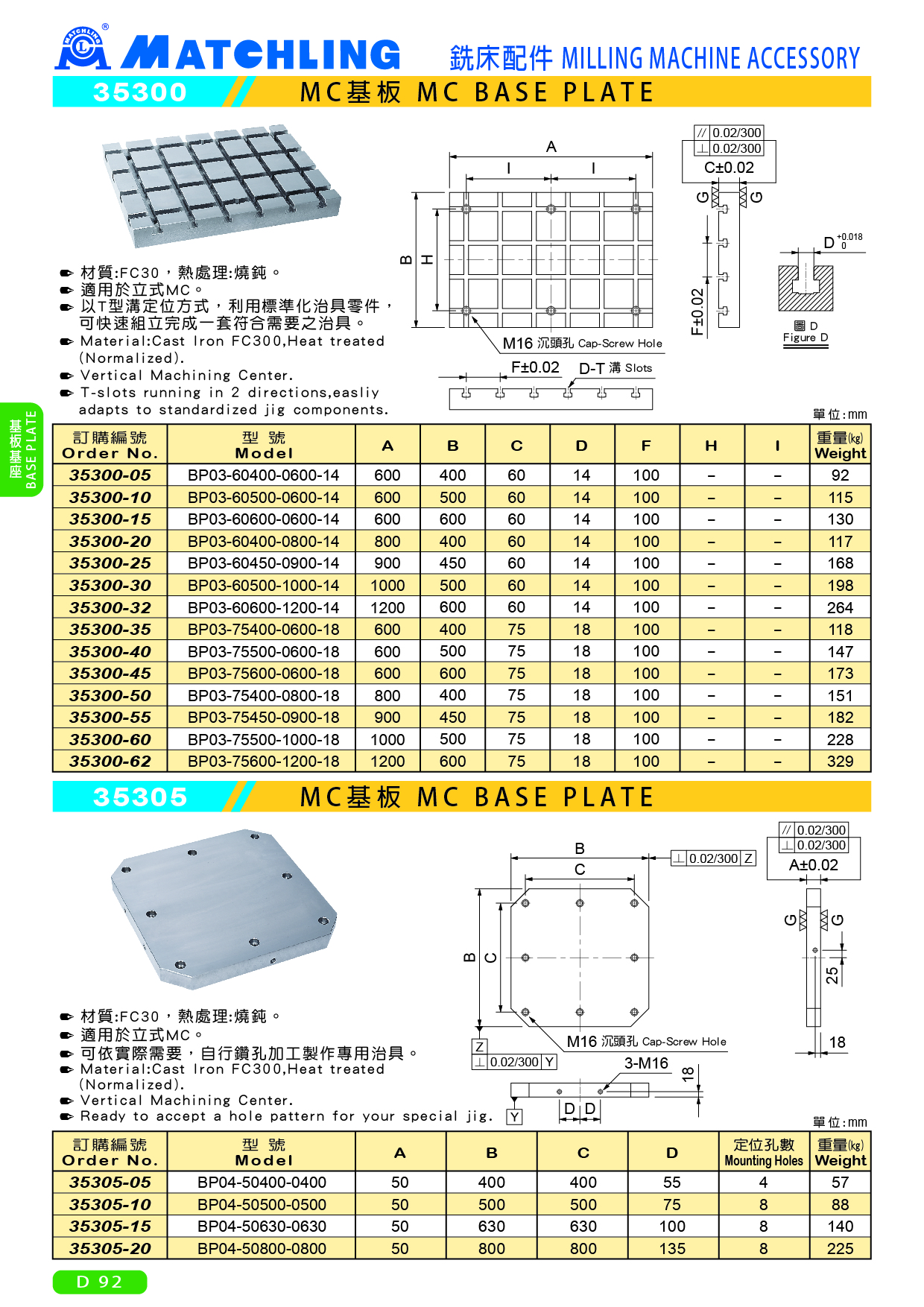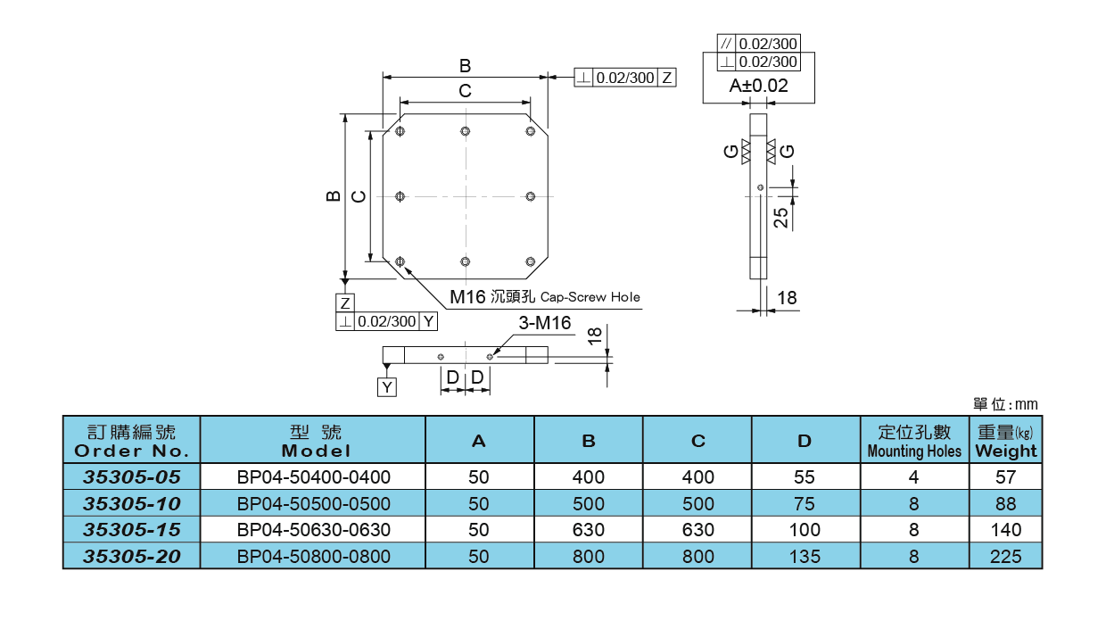 ● 材質:FC30,熱處理:燒鈍。 ● 適用於臥式MC。 ● 可依實際需要,自行鑽孔加工製作專用治具。 BP04-50400-0400 BP04-50500-0500 BP04-50630-0630 BP04-50800-0800
