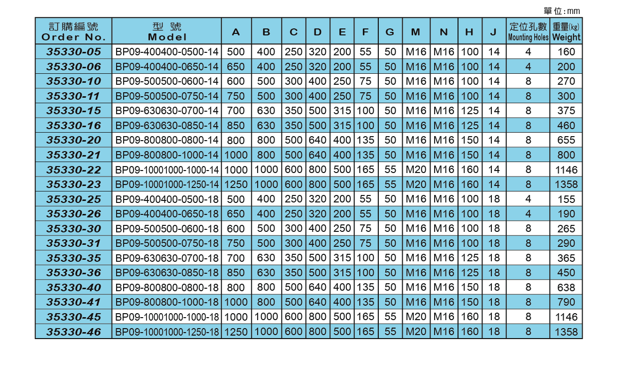 BP09-400400-0500-14 BP09-400400-0650-14 BP09-500500-0600-14 BP09-500500-0750-14 BP09-630630-0700-14 BP09-630630-0850-14 BP09-800800-0800-14 BP09-800800-1000-14 BP09-10001000-1000-14 BP09-10001000-1250-14 BP09-400400-0500-18 BP09-400400-0650-18 BP09-500500-0600-18 BP09-500500-0750-18 BP09-630630-0700-18 BP09-630630-0850-18 BP09-800800-0800-18 BP09-800800-1000-18 BP09-10001000-1000-18 BP09-10001000-1250-18