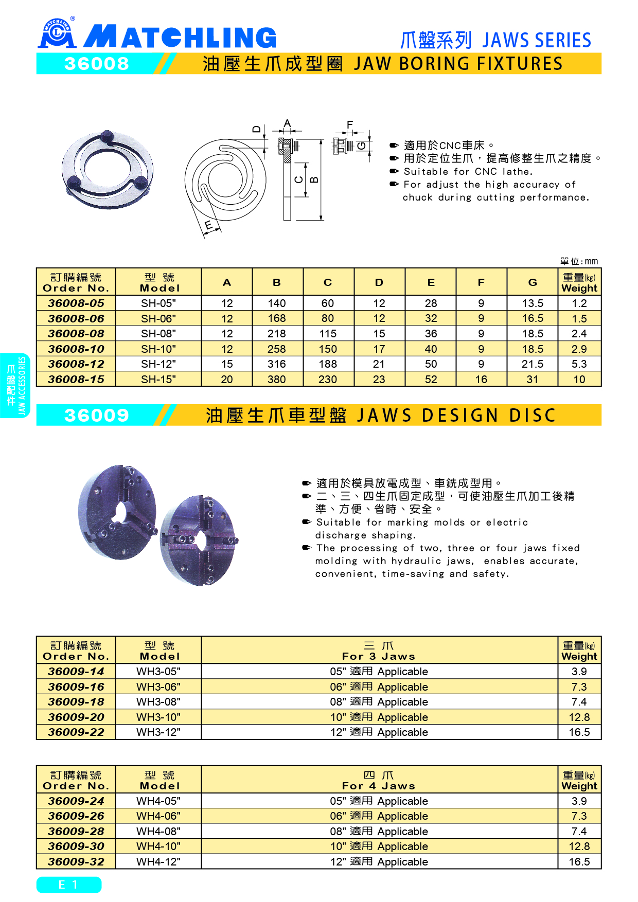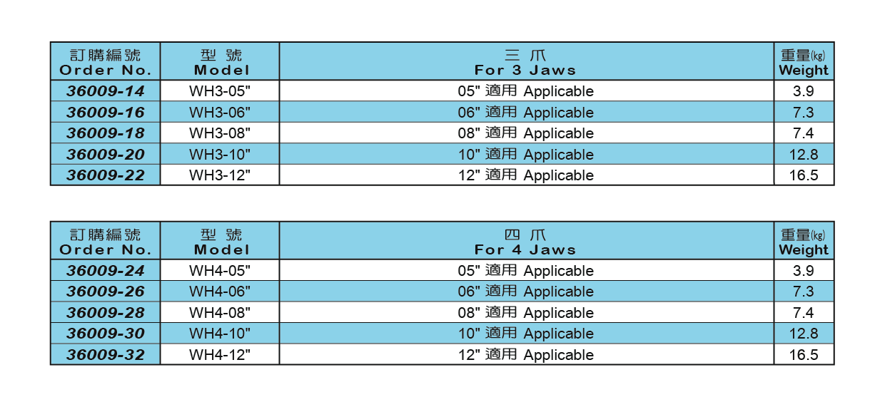 ● 適用於模具放電成型、車銑成型用。 ● 二、三、四生爪固定成型,可使油壓生爪加工後精準、方便、省時、安全。 WH3-05" WH3-06" WH3-08" WH3-10" WH3-12" WH4-05" WH4-06" WH4-08" WH4-10" WH4-12"