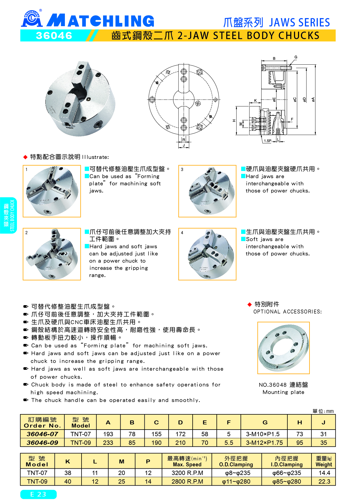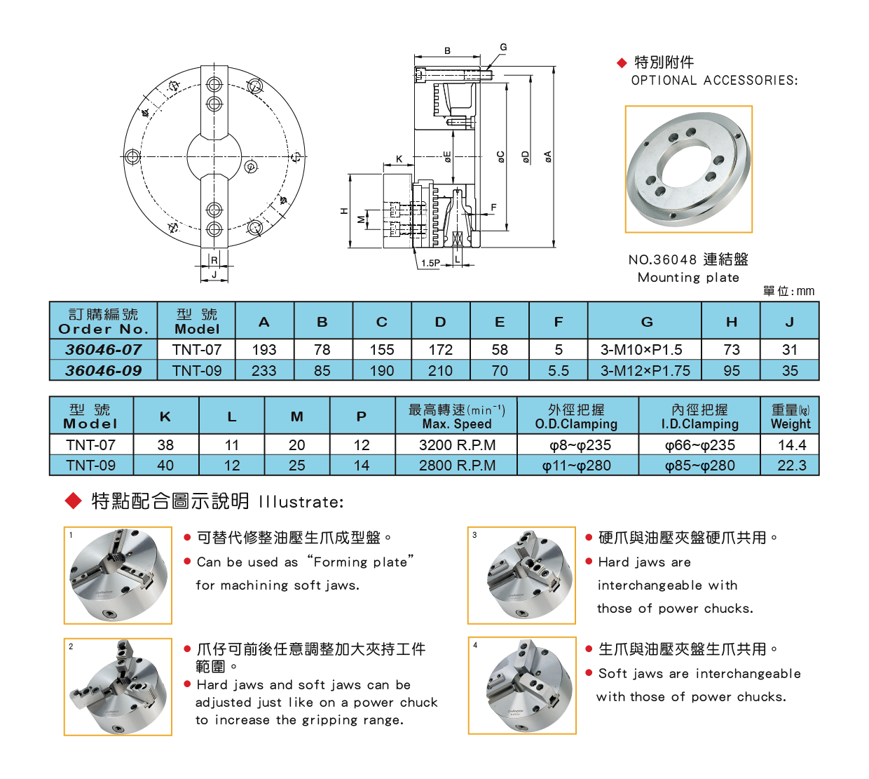 ● 可替代修整油壓生爪成型盤。 ● 爪仔可前後任意調整,加大夾持工件範圍。 ● 生爪及硬爪與CNC車床油壓生爪共用。 ● 鋼殼結構於高速迴轉時安全性高,耐磨性強,使用壽命長。 ● 轉動板手扭力較小,操作順暢。 TNT-07 TNT-09