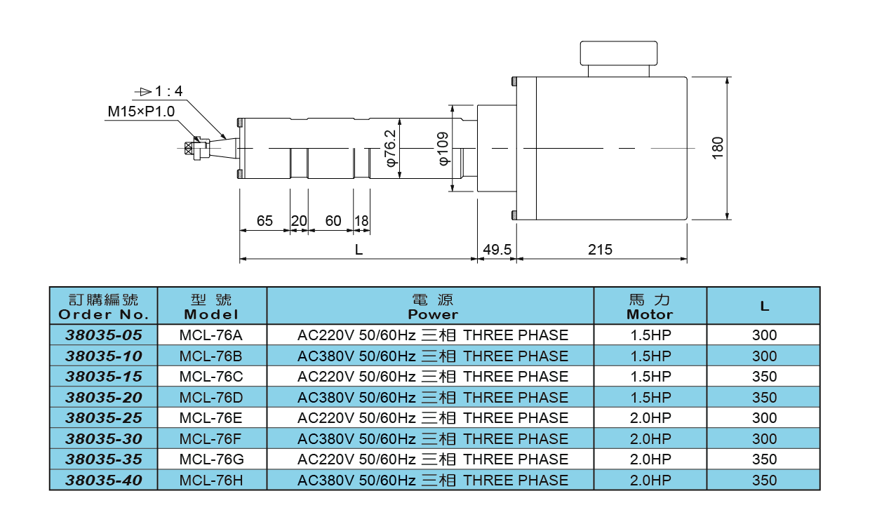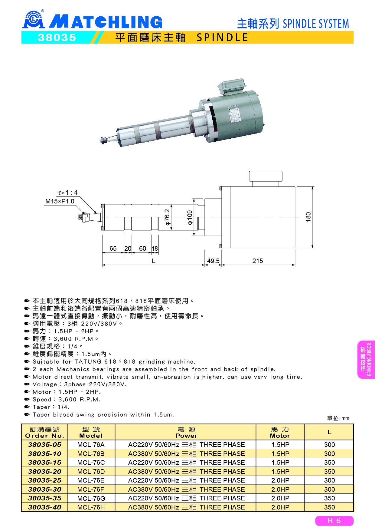 ● 本主軸適用於大同規格系列618、818平面磨床使用。 ● 主軸前端和後端各配置有兩個高速精密軸承。 ● 馬達一體式直接傳動,振動小,耐磨性高,使用壽命長。 ● 適用電壓:3相 220V/380V。 ● 馬力:1.5HP ~ 2HP。 ● 轉速:3,600 R.P.M。 ● 錐度規格:1/4。 ● 錐度偏擺精度:1.5um內。 MCL-76A MCL-76B MCL-76C MCL-76D MCL-76E MCL-76F MCL-76G MCL-76H
