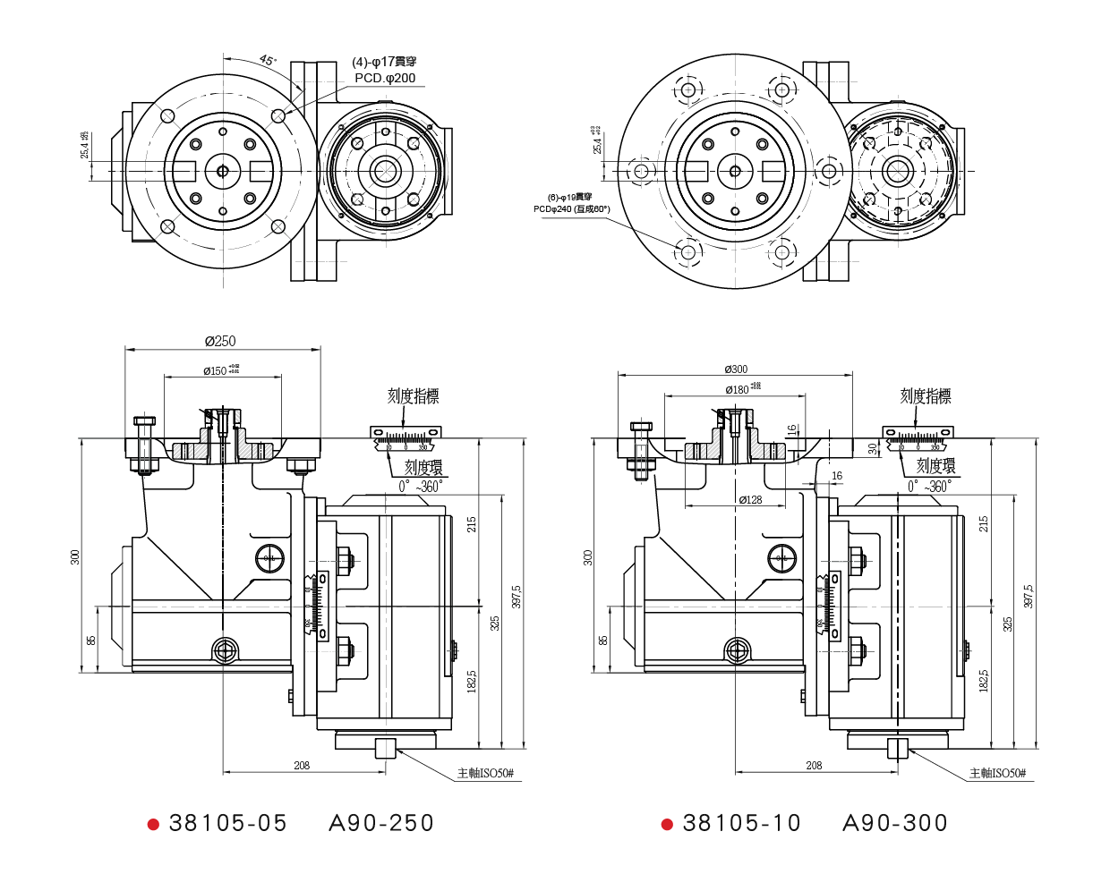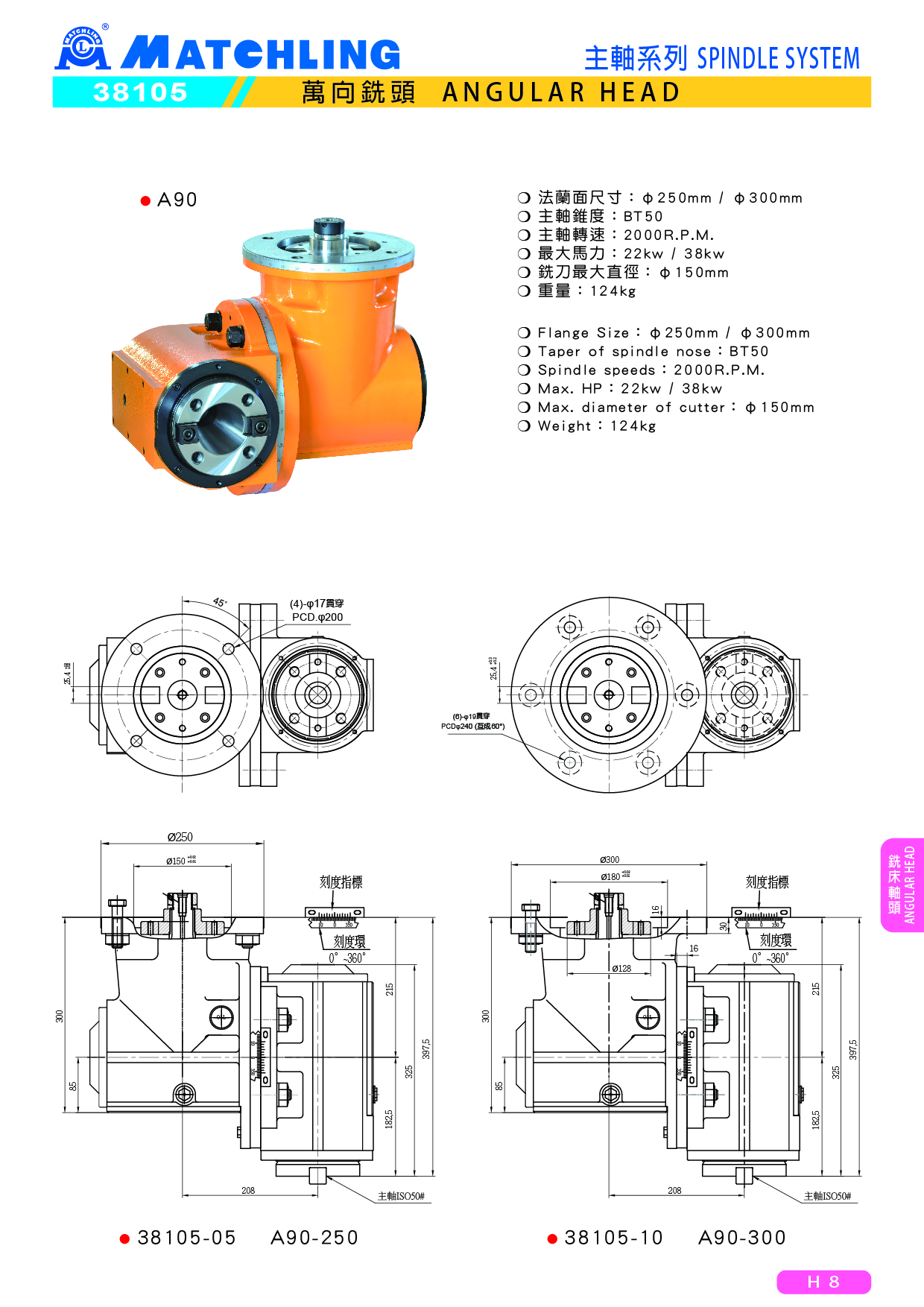 ● 法蘭面尺寸:φ250mm / φ300mm ● 主軸錐度:BT50 ● 主軸轉速:2000R.P.M. ● 最大馬力:22kw / 38kw ● 銑刀最大直徑:φ150mm ● 重量:124kg A90-250 A90-300 A77-250 A77-208