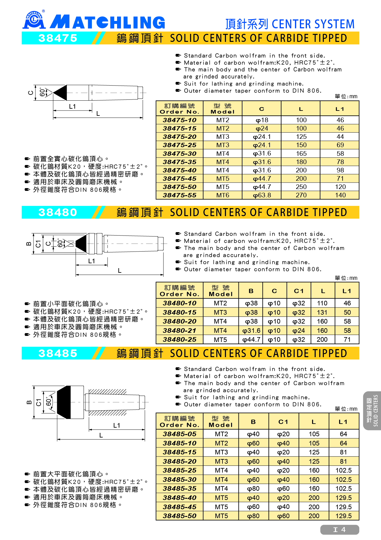 ● 前置小平面碳化鎢頂心。 ● 碳化鎢材質K20,硬度:HRC75˚±2˚。 ● 本體及碳化鎢頂心皆經過精密研磨。 ● 適用於車床及圓筒磨床機械。 ● 外徑錐度符合DIN 806規格。 MT2 MT3 MT4 MT5