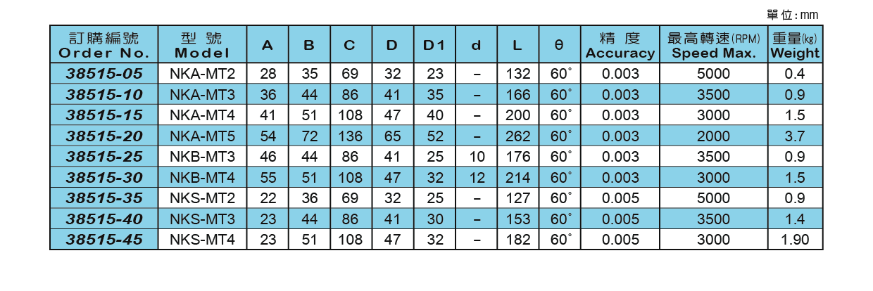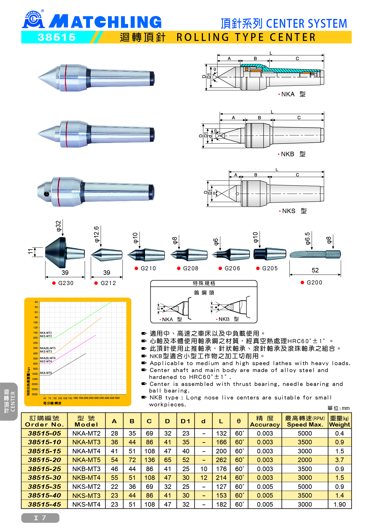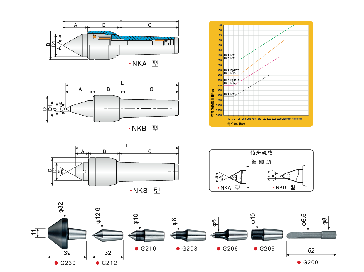 ● 適用中、高速之車床以及中負載使用。 ● 心軸及本體使用軸承鋼之材質,經真空熱處理HRC60˚±1˚ 。 ● 此頂針使用止推軸承,針狀軸承、滾針軸承及滾珠軸承之組合。 ● NKB型適合小型工作物之加工切削用。 NKA-MT2 NKA-MT3 NKA-MT4 NKA-MT5 NKB-MT3 NKB-MT4 NKS-MT2 NKS-MT3 NKS-MT4