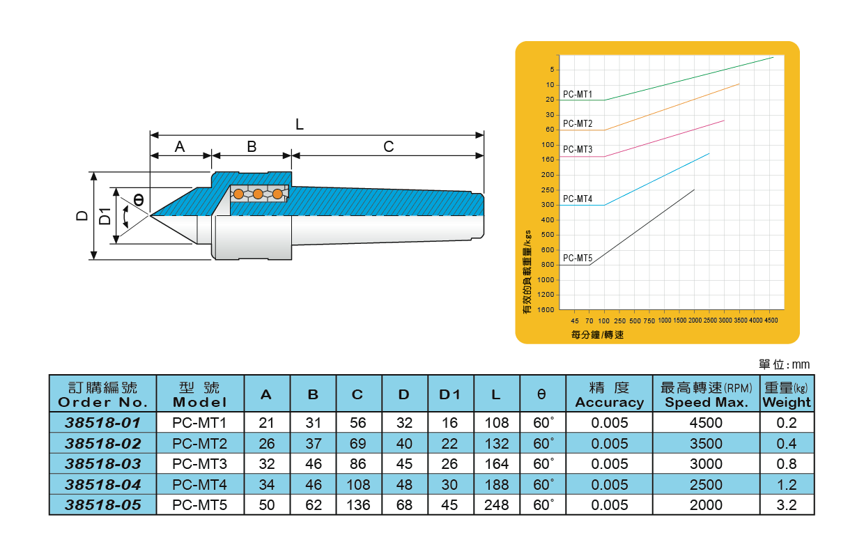 ● 此頂針適用於中、高速車床及輕負載使用。 ● 使用鉻鉬鋼之材質,經熱處理HRC58˚~60˚ 具高剛性。 ● 使用滾珠軸承之組合。 PC-MT1 PC-MT2 PC-MT3 PC-MT4 PC-MT5