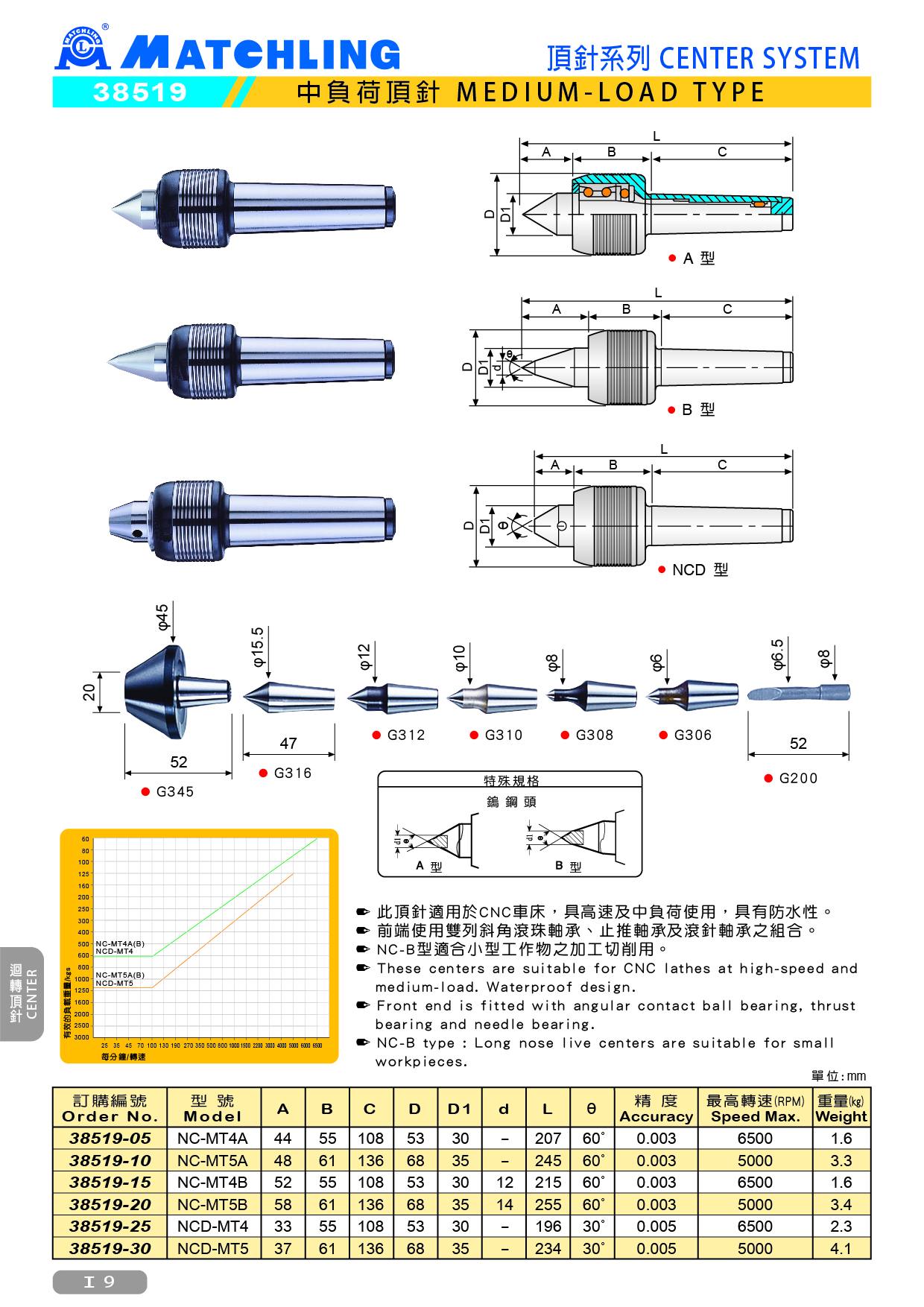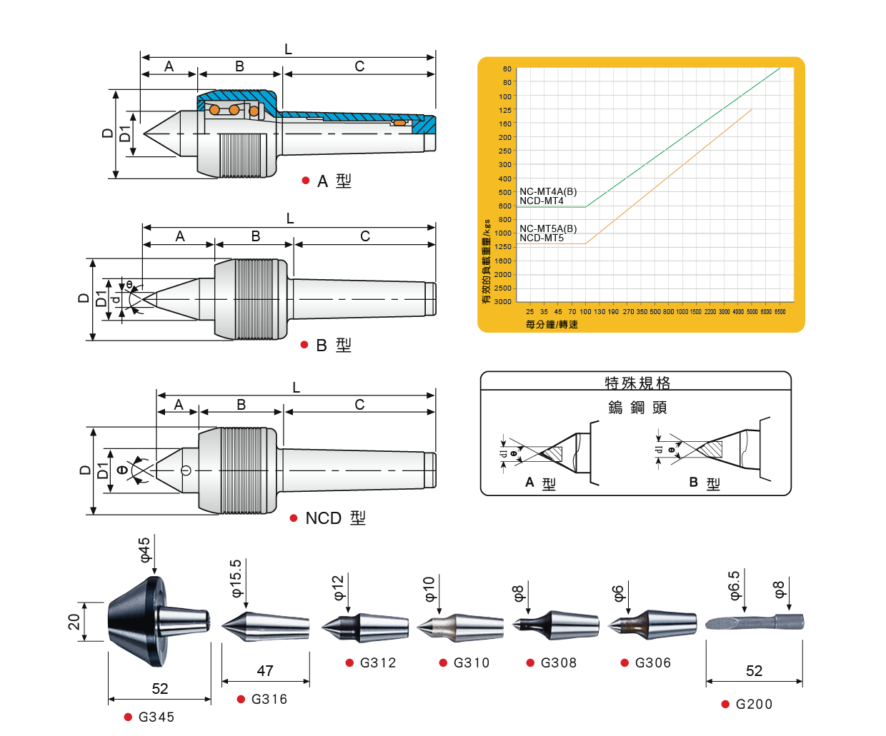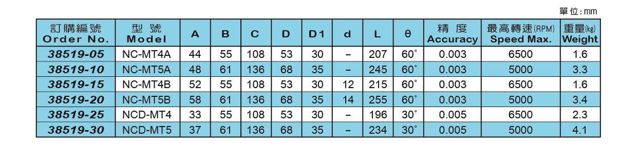 ● 此頂針適用於CNC車床,具高速及中負荷使用,具有防水性。 ● 前端使用雙列斜角滾珠軸承、止推軸承及滾針軸承之組合。 ● NC-B型適合小型工作物之加工切削用。 NC-MT4A NC-MT5A NC-MT4B NC-MT5B NCD-MT4 NCD-MT5