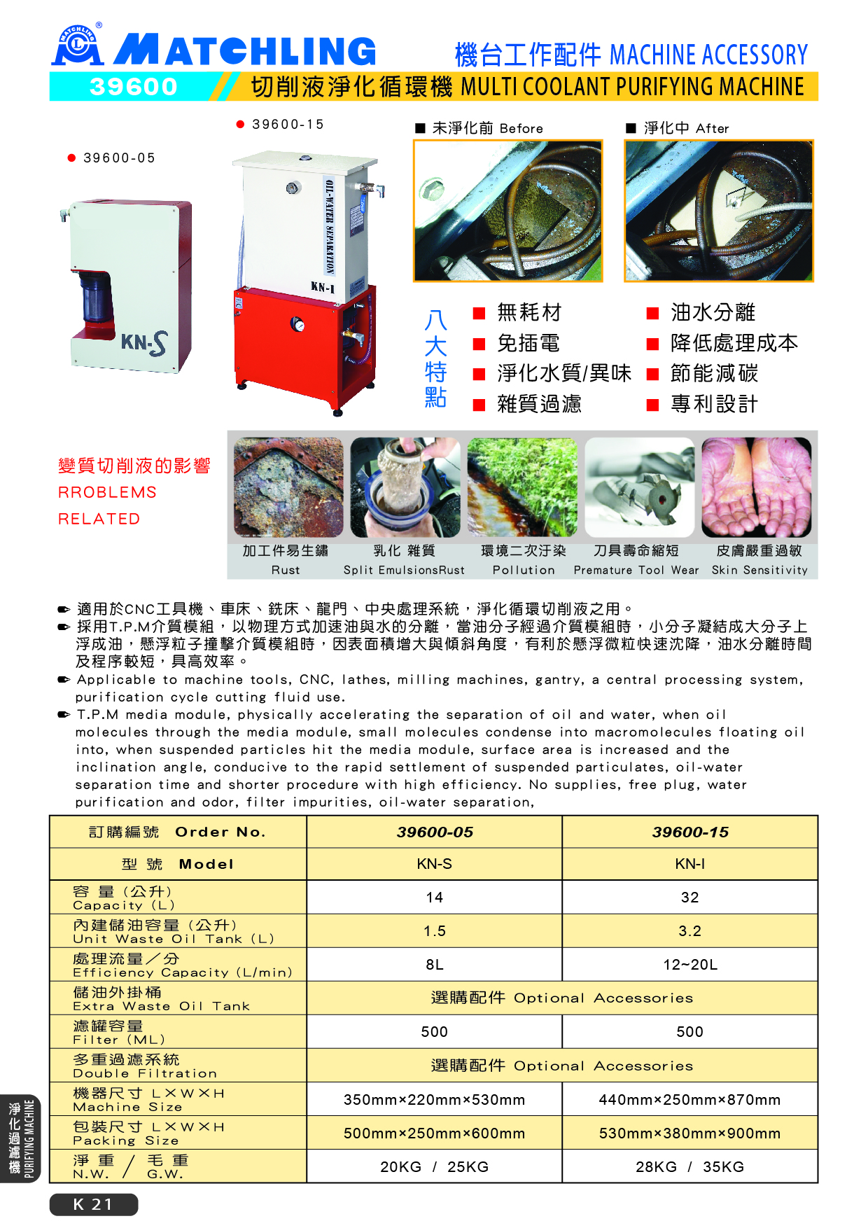 ● 適用於CNC工具機、車床、銑床、龍門、中央處理系統,淨化循環切削液之用。 ● T.P.M介質模組,以物理方式加速油與水的分離,當油分子經過介質模組時,小分子凝結成大分子上浮成油,懸浮粒子撞擊介質模組時,因表面積增大與傾斜角度,有利於懸浮微粒快速沈降,油水分離時間及程序較短,具高效率。。