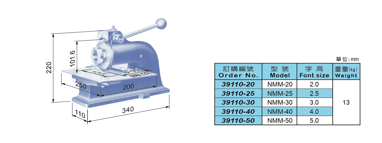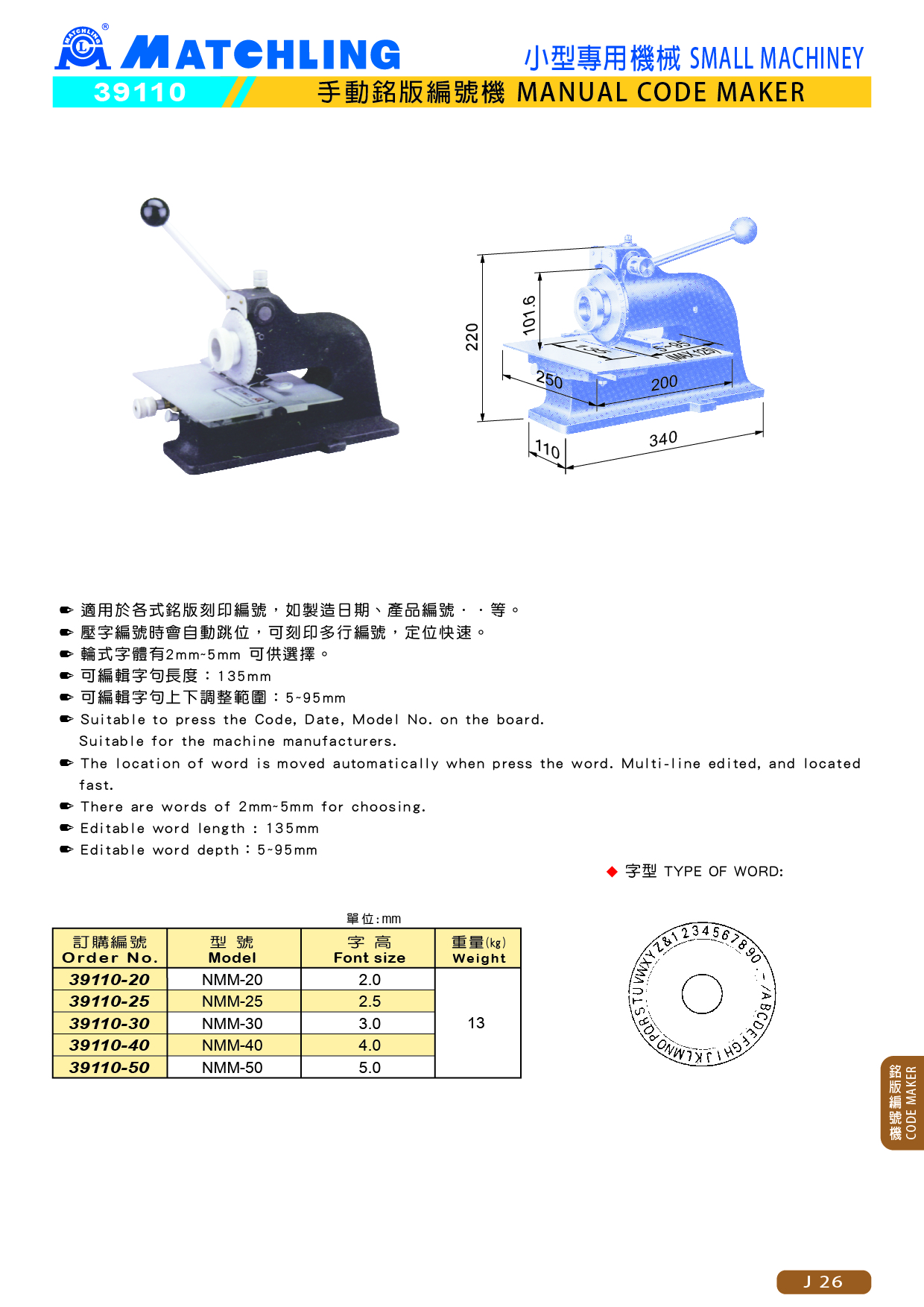 ● 適用於各式銘版刻印編號,如製造日期、產品編號..等。 ● 壓字編號時會自動跳位,可刻印多行編號,定位快速。 ● 輪式字體有2mm~5mm 可供選擇。 ● 可編輯字句長度:135mm ● 可編輯字句上下調整範圍:5~95mm NMM-20 NMM-25 NMM-30 NMM-40 NMM-50