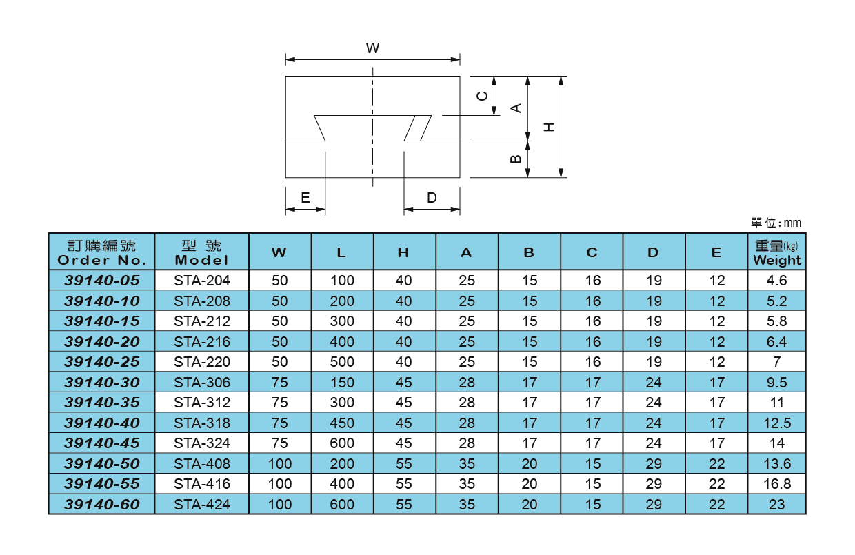 ● 適用於各式機械,配合需求組裝使用。 ● 材質:FC30,滑動面銑床加工(無研磨)。 NSTA-204 STA-208 STA-212 STA-216 STA-220 STA-306 STA-312 STA-318 STA-324 STA-408 STA-416 STA-424