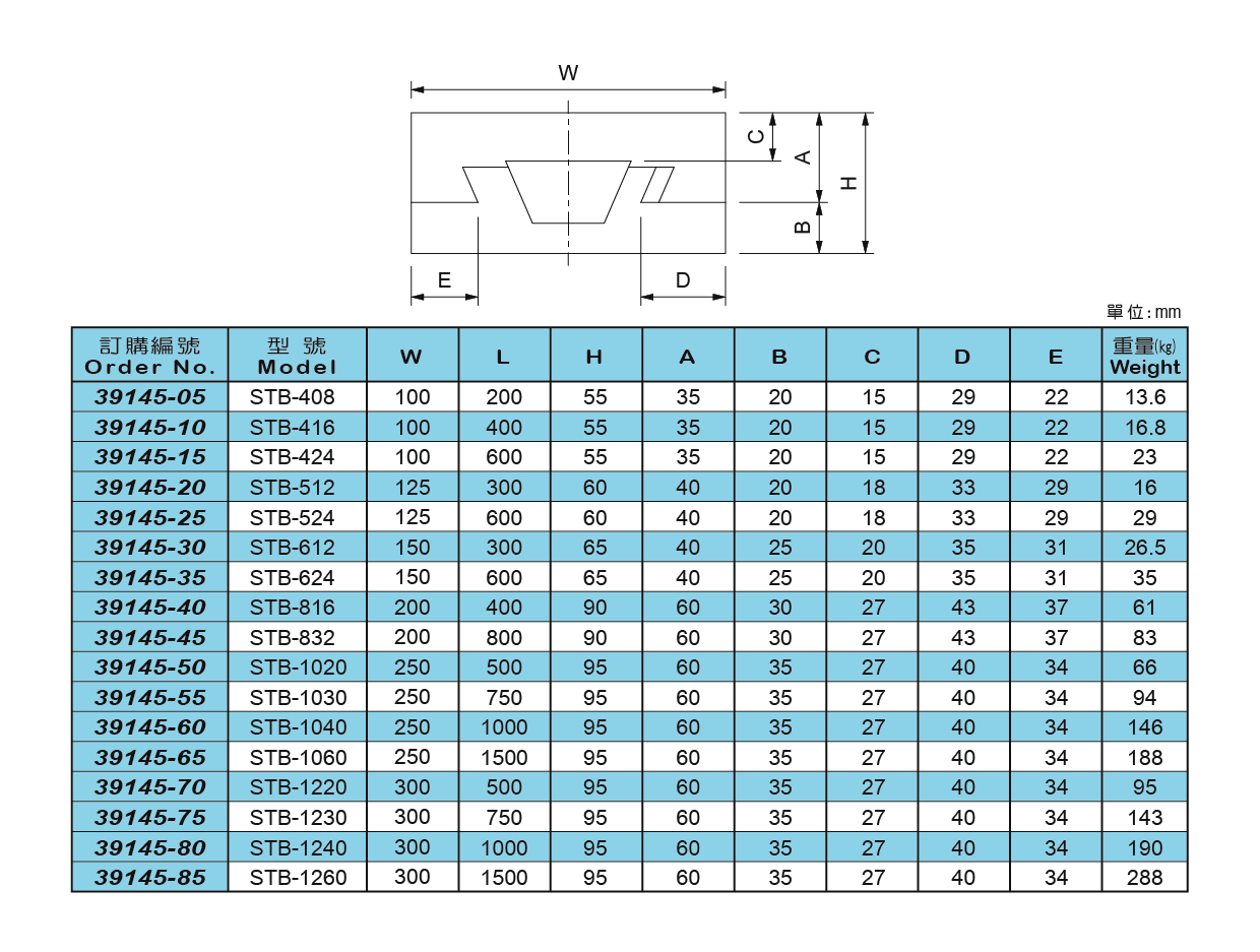 ● 適用於各式機械,配合需求組裝使用。 ● 材質:FC30,滑動面銑床加工(無研磨)。 STB-408 STB-416 STB-424 STB-512 STB-524 STB-612 STB-624 STB-816 STB-832 STB-1020 STB-1030 STB-1040 STB-1060 STB-1220 STB-1230 STB-1240 STB-1260