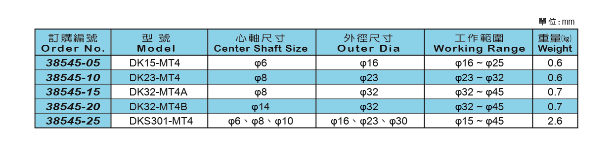 ● 此免夾頂針因機械之結構,故障率低,經深冷熱處理HRC60˚±1˚ 。 ● 以往車床加工使用帶動環來帶動,避免工作物之停止,此款頂針在本體端面有6T及8T之設計來頂住加工面之端面,就可免用帶動環,使加工方便、速度更快。 ● 此款免夾頂針可適用於滾齒機械。 DK15-MT4 DK23-MT4 DK32-MT4A DK32-MT4B DKS301-MT4