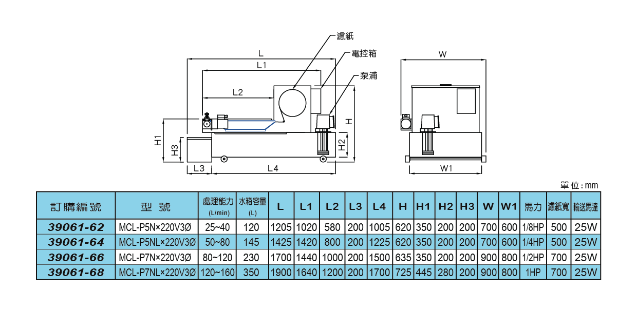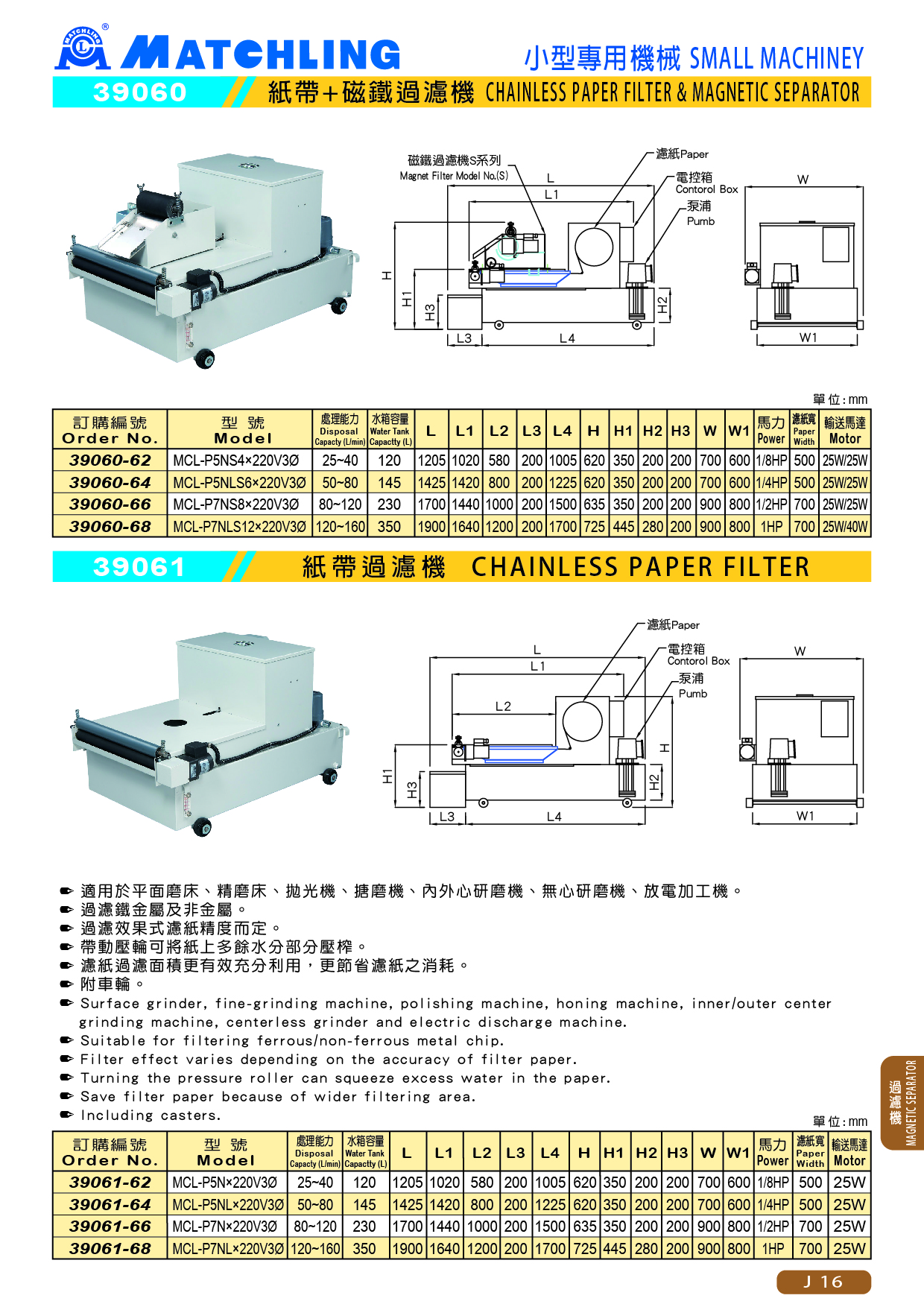 ● 適用於平面磨床、精磨床、拋光機、搪磨機、內外心研磨機、無心研磨機、放電加工機。 ● 過濾鐵金屬及非金屬。 ● 過濾效果式濾紙精度而定。 ● 帶動壓輪可將紙上多餘水分部分壓榨。 ● 濾紙過濾面積更有效充分利用,更節省濾紙之消耗。 ● 附車輪。 MCL-P5N×220V3Ø MCL-P5NL×220V3Ø MCL-P7N×220V3Ø MCL-P7NL×220V3Ø
