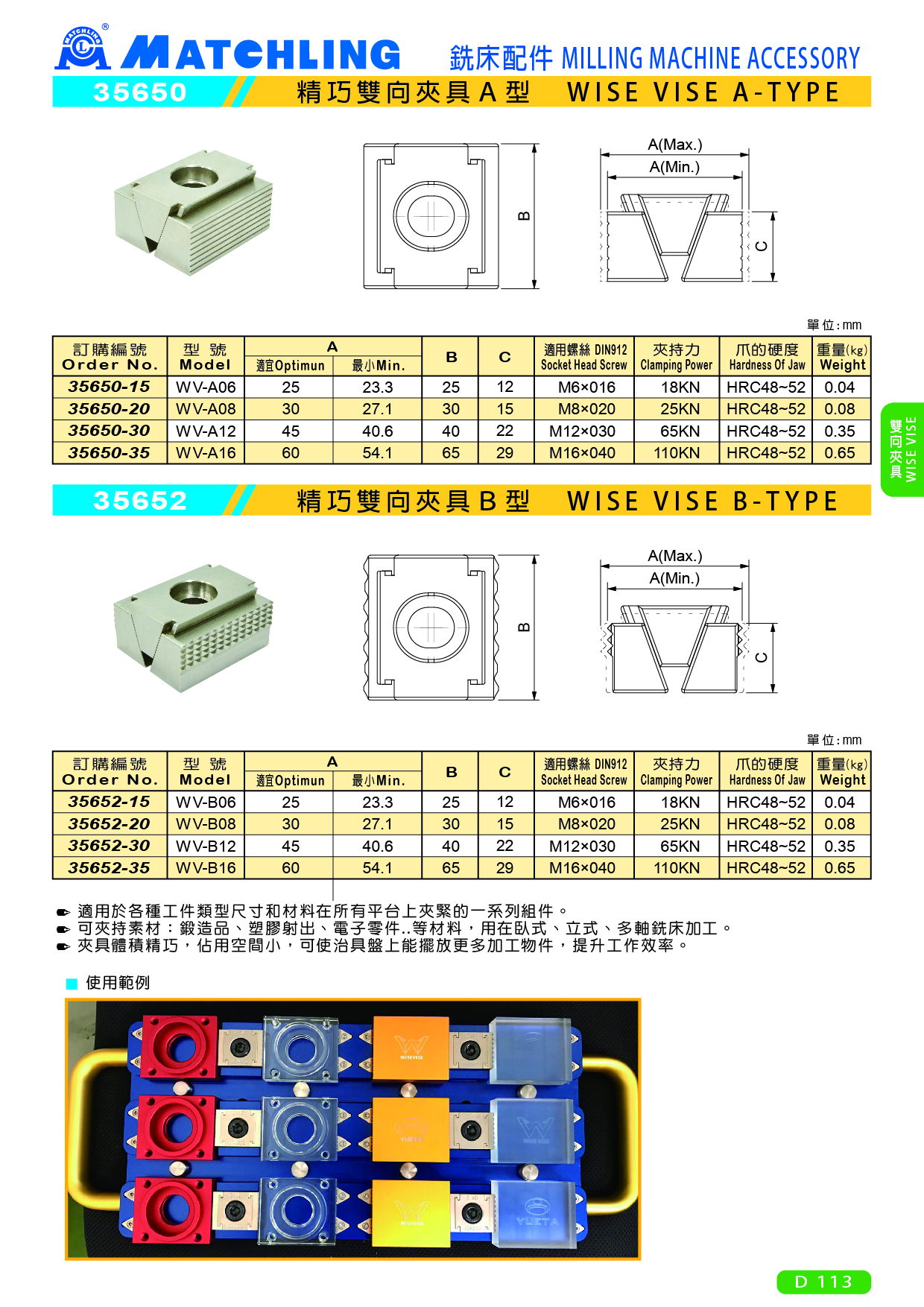 ● 適用於各種工件類型尺寸和材料在所有平台上夾緊的一系列組件。 ● 可夾持素材:鍛造品、塑膠射出、電子零件..等材料,用在臥式、立式、多軸銑床加工。 ● 夾具體積精巧,佔用空間小,可使治具盤上能擺放更多加工物件,提升工作效率。 WV-B06 WV-B08 WV-B10 WV-B12 WV-B16