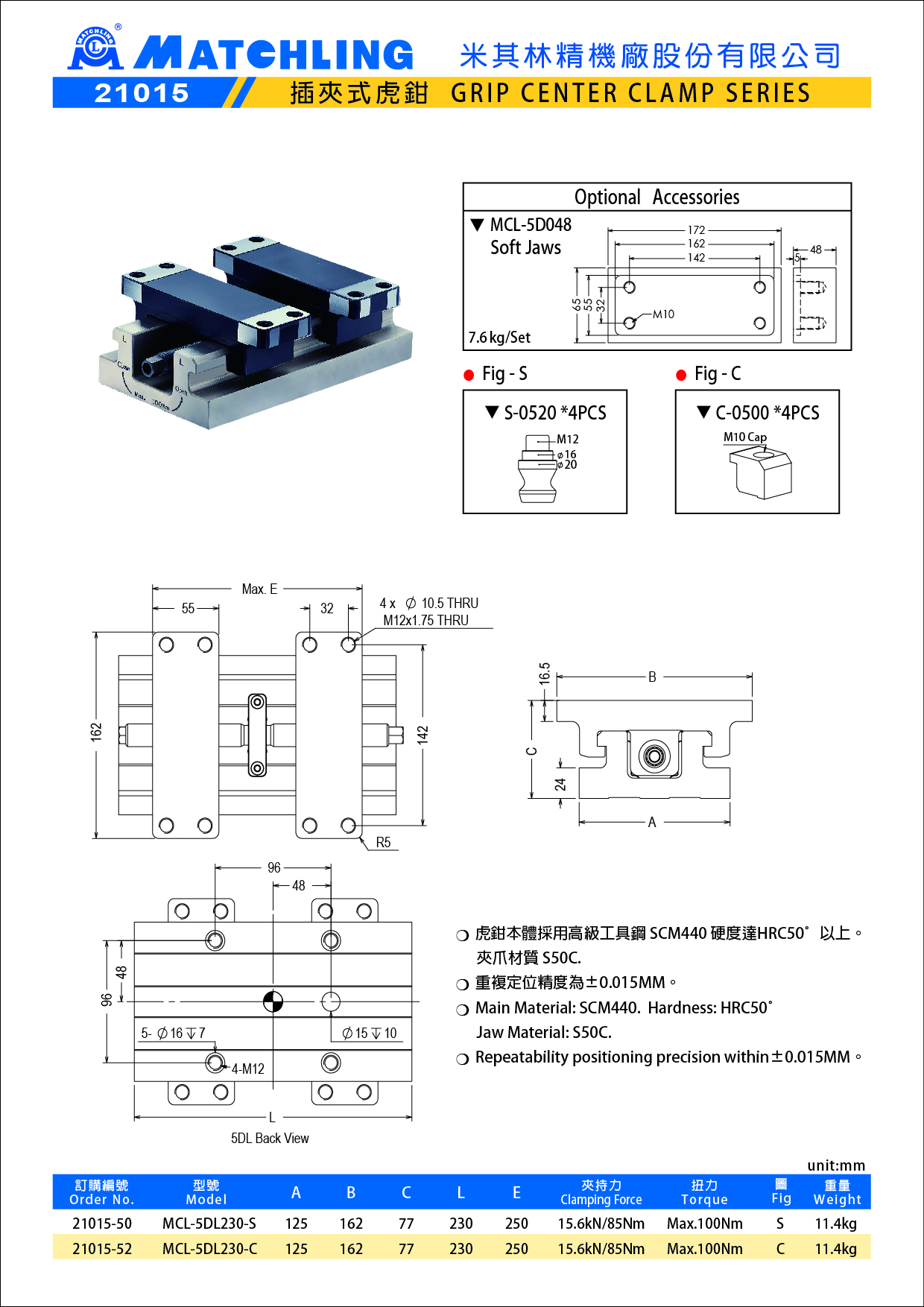 | 21015-52 | MCL-5DL230-C | 125 | 162 | 77 | 230 | 250 | 15.6kN/85Nm | Max.100Nm | C | 11.4 |